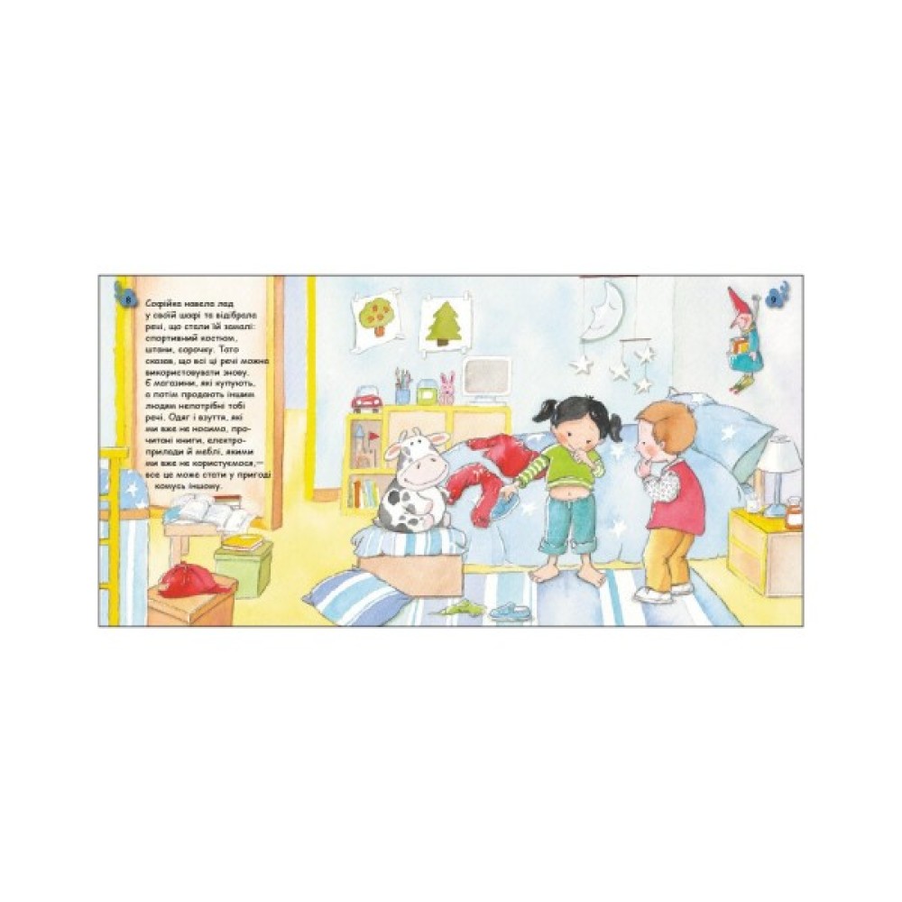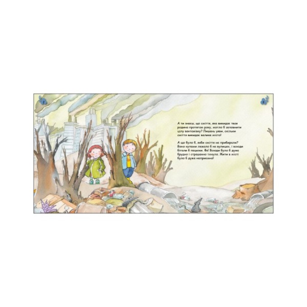 «Турбота про планету» — нова серія екокнижок! Люди використовують у своєму побуті чимало речей. Більшість із цього одного дня стане сміттям. У цій книжці ти дізнаєшся, звідки беруться відходи, як можна зменшити шкоду від них і що може статися, якщо цього не робити. Окрім пізнавальної інформації маленькі читачі знайдуть інструкцію до тематичних саморобок, як-от переробленого паперу. А в кінці книжки є підказки для батьків, які допоможуть більш ґрунтовно пояснити дитині прочитане. Подбаймо про нашу планету!