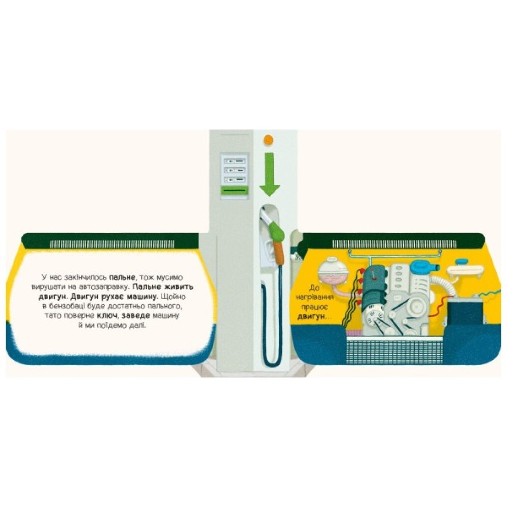 Якщо ваш малюк цікавиться машинами, ця книжка обов’язково йому сподобається. Разом із героями історії та їхнім татом маленький читач зазирне під капот старенької автівки, дізнається про її складну механіку, принцип роботи двигуна та основні правила водіння. Зазирне у таємні вирізи і розкрийте технологічні секрети машини, невидимі ззовні.