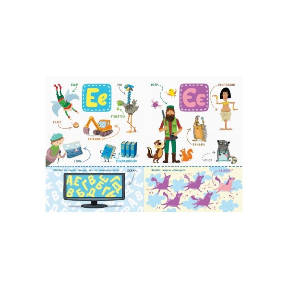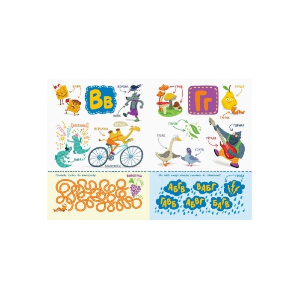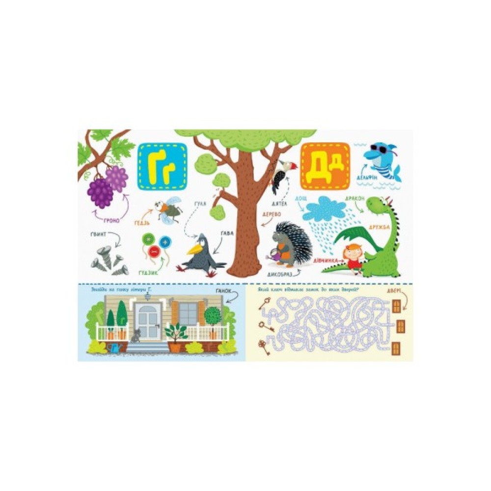 Книга познайомить малюка з абеткою та допоможе зробити перші кроки у читанні. На кожній сторінці багато предметів на певну літеру, а також завдання для кращого засвоєння абетки.