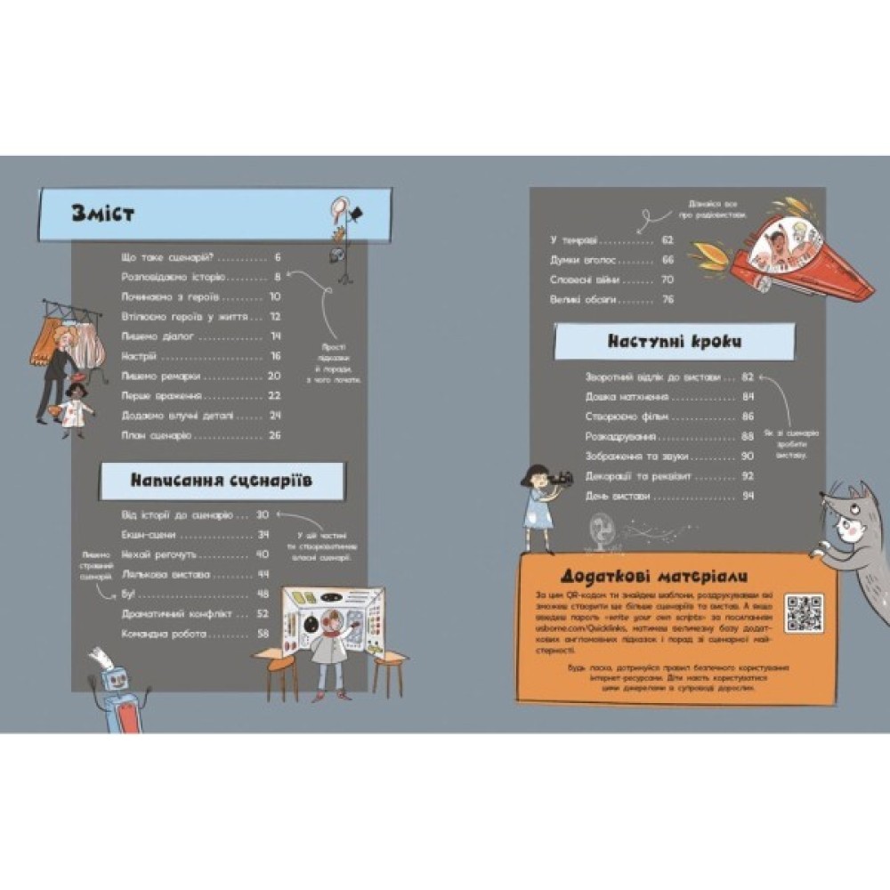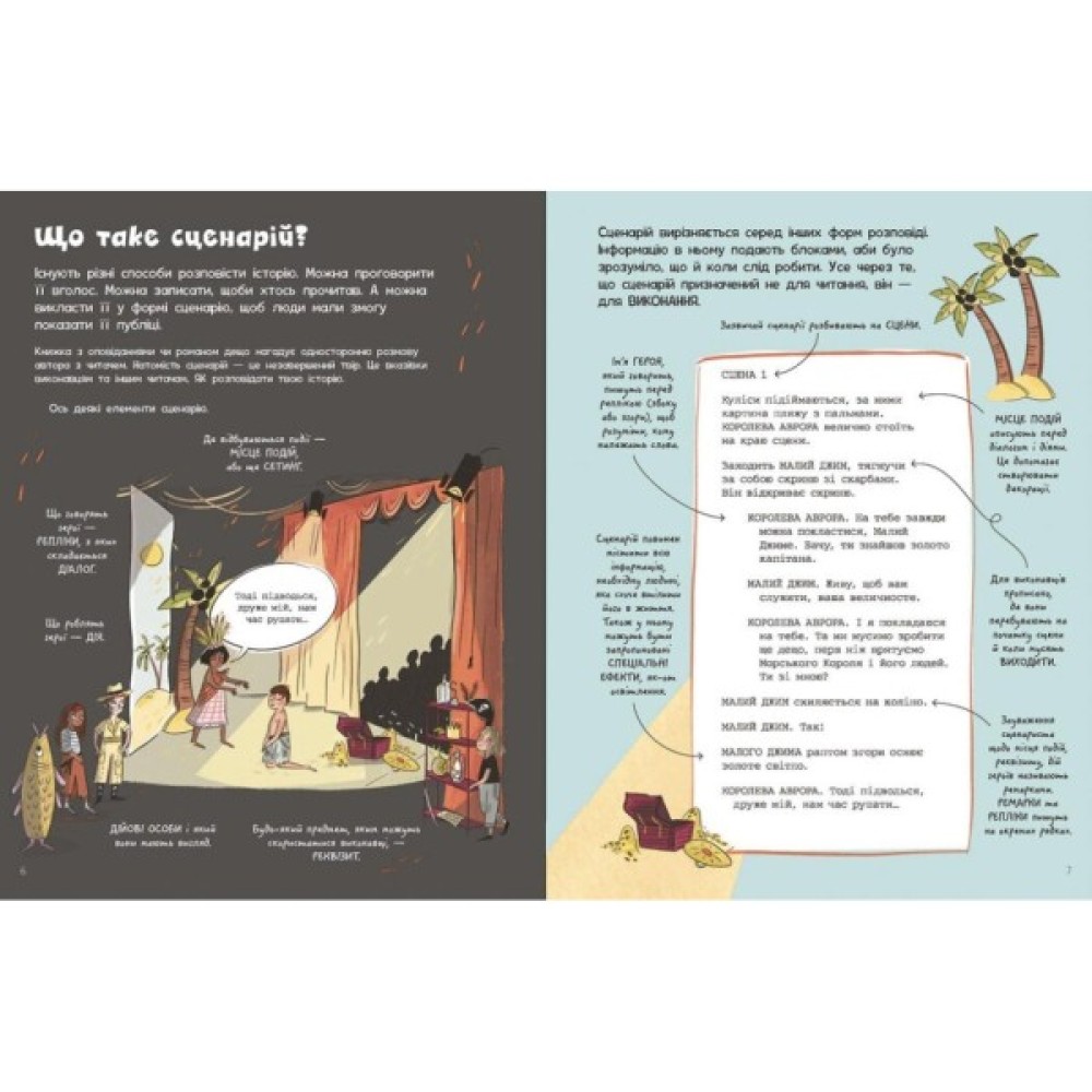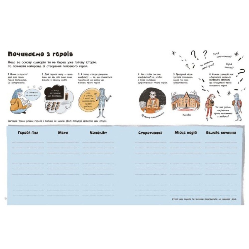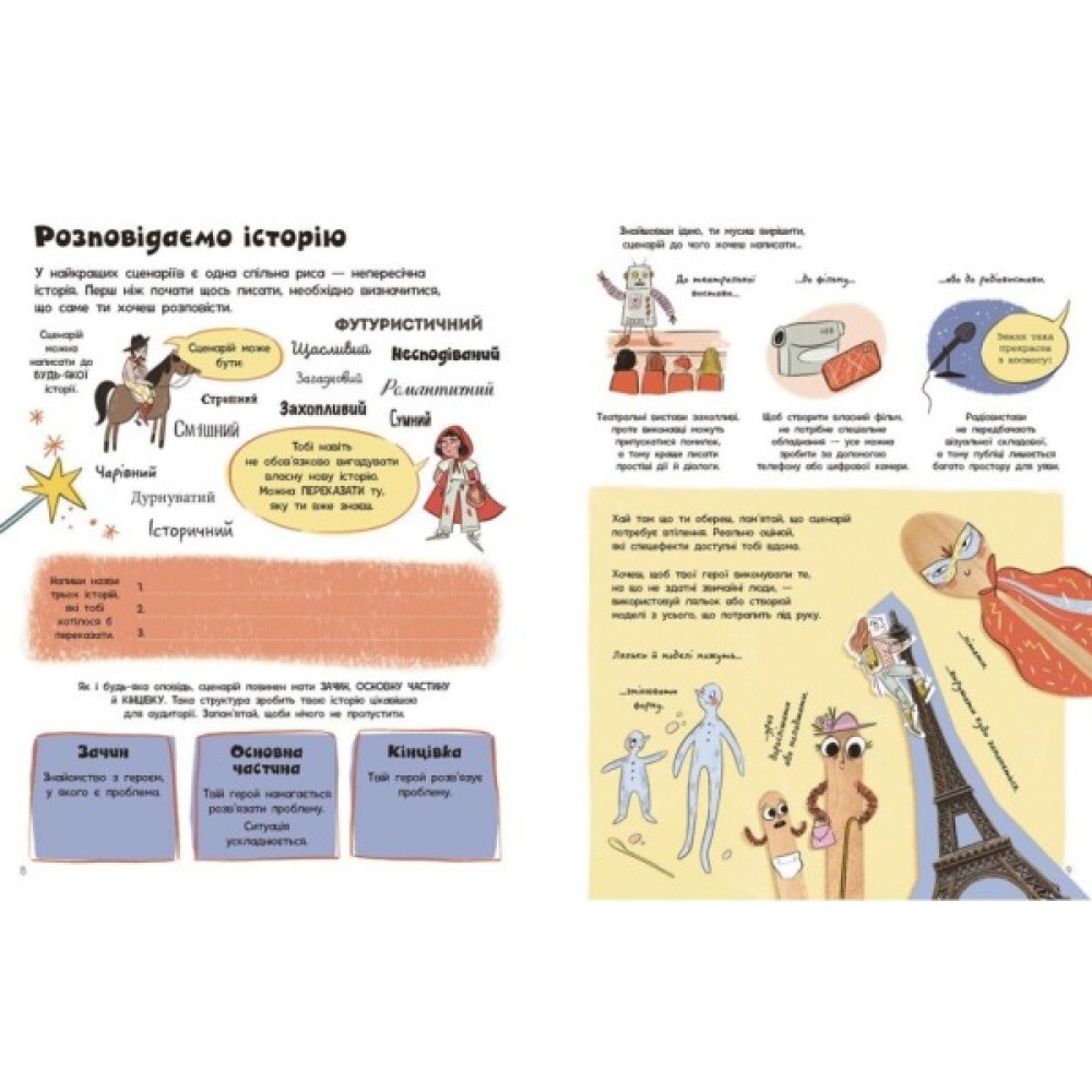 Ця книжка — найкреативніший путівник для школярів і школярок, які люблять вигадувати власні історії та мріють перетворювати їх на фільми й вистави. Ідеї та поради зі сценарної майстерності, якими сповнена книжка, допоможуть створювати вистави різних жанрів: від комедії до екшену. Перша частина порадника навчить планувати сцени, працювати в команді й навіть добирати реквізит! А також – покроково пояснить, як до дрібниць продумати героїв, написати якісні діалоги й ремарки та створити відповідний настрій.А в другій частині книжки юні митці втілять усе задумане із задоволенням! Адже тут безліч практичних завдань і не менше дієвих підказок. Гайда на кіноекрани!