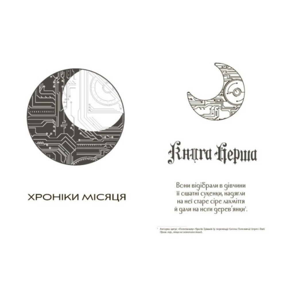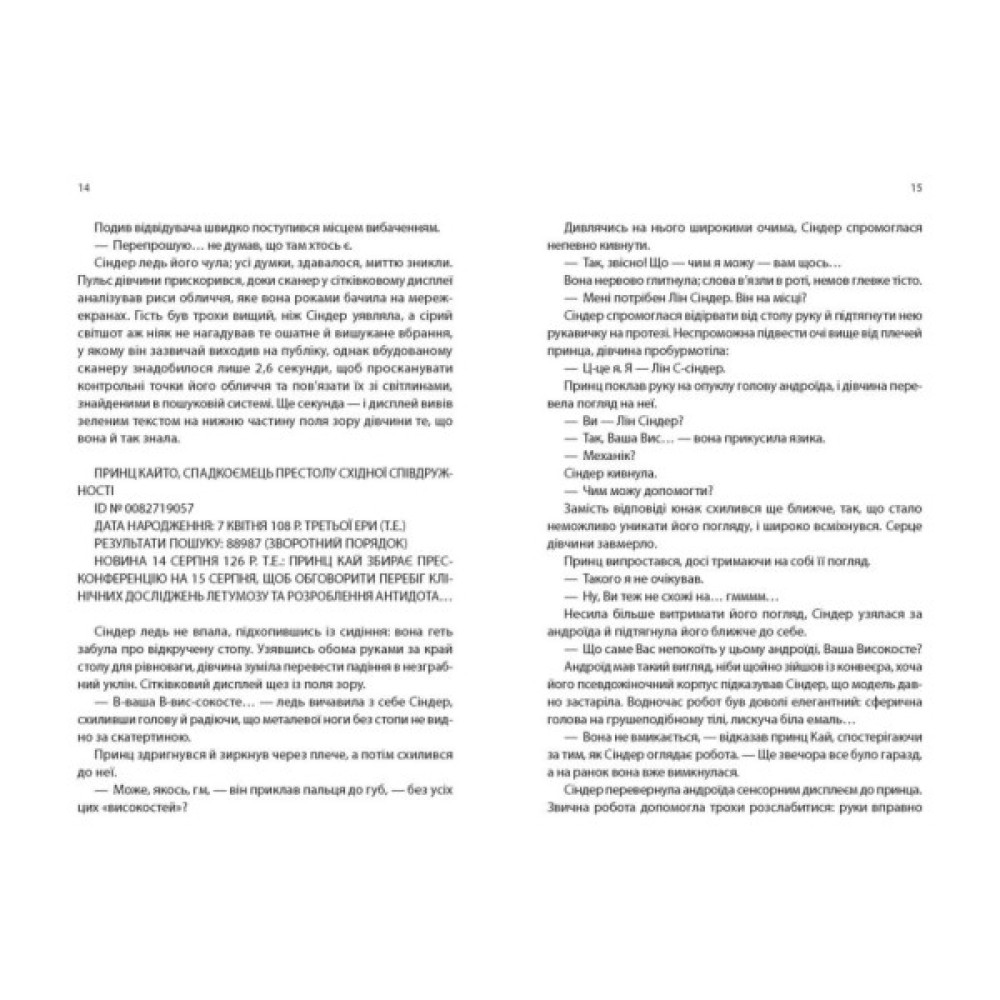 Сіндер, шістнадцятирічна дівчина, чи не найкращий механік Нью-Пекіна. Однак кого цікавить якийсь кіборг — мачуха Сіндер не любить, а інші її зневажають. Таке собі життя, така собі робота в майстерні на міському ринку… Проте все міняється, коли в її крамничці з’являється принц Кай із Нейнсі, поламаним андроїдом. Принц захоплюється Сіндер, не знаючи, що вона кіборг — істота другого сорту. Кай узагалі не уявляє, що дуже скоро і він, і вона опиняться в тугому вузлу інтриг і таємниць. Колонія Місяця, очолювана безжальною та могутньою королевою Леваною, що плекає надію загарбати земні імперії; її армія мутантів і магів-тавматургів; невиліковна хвороба, яка викошує землян; таємничий доктор Ерланд — усе це тісно пов’язано із секретами Сіндер, про які дівчина ще вчора гадки не мала, а сьогодні їй потрібно пірнати в самий центр космічного шторму!