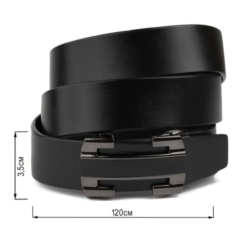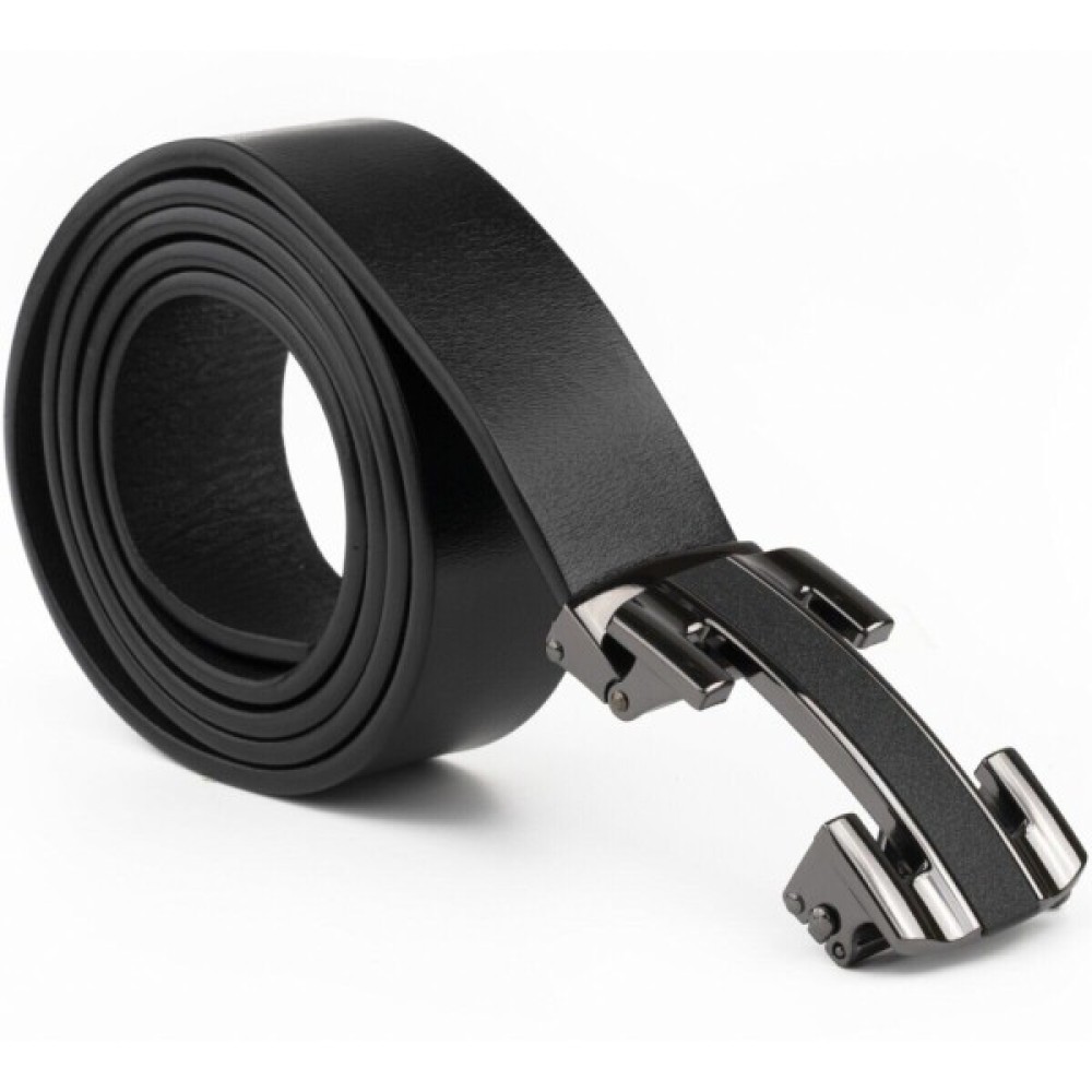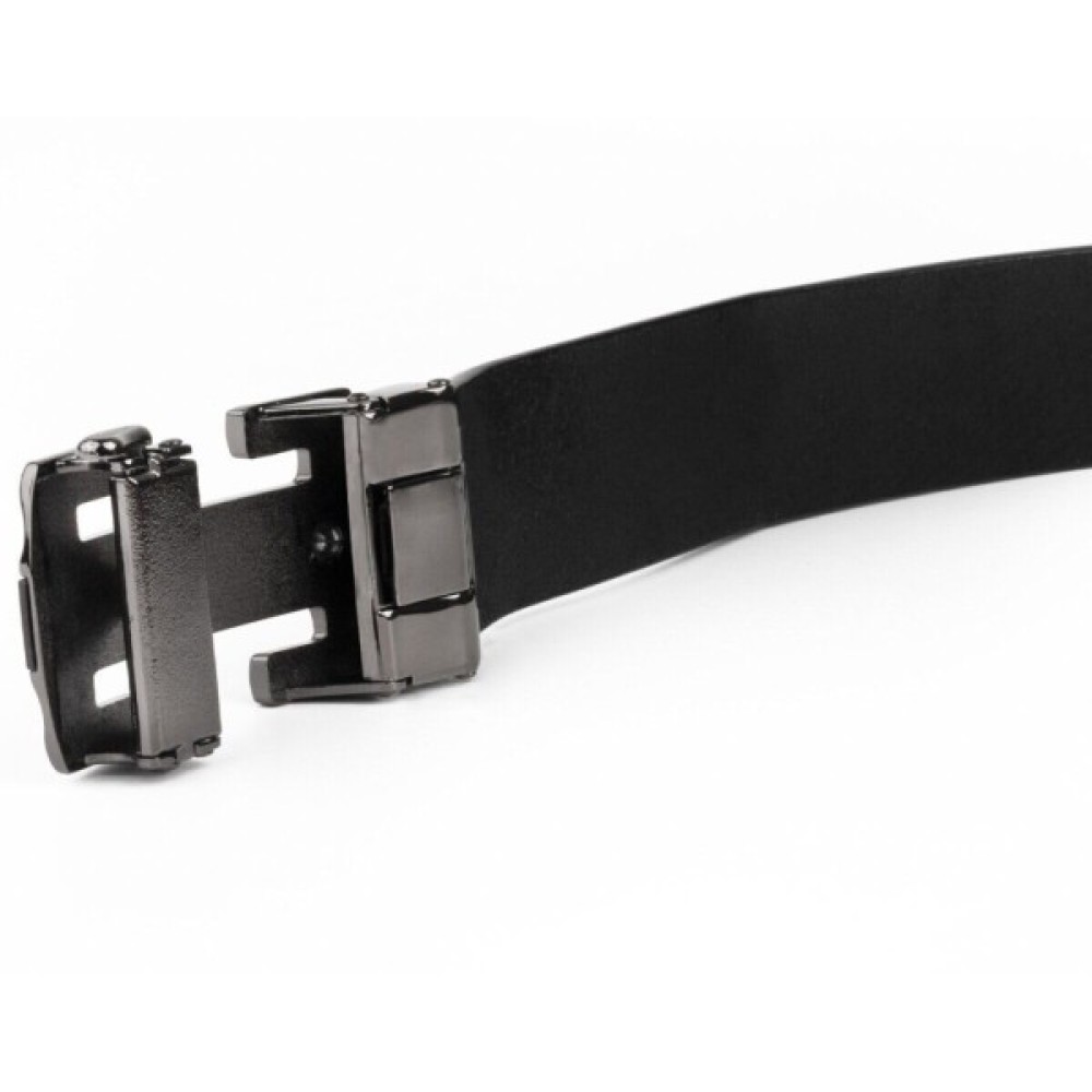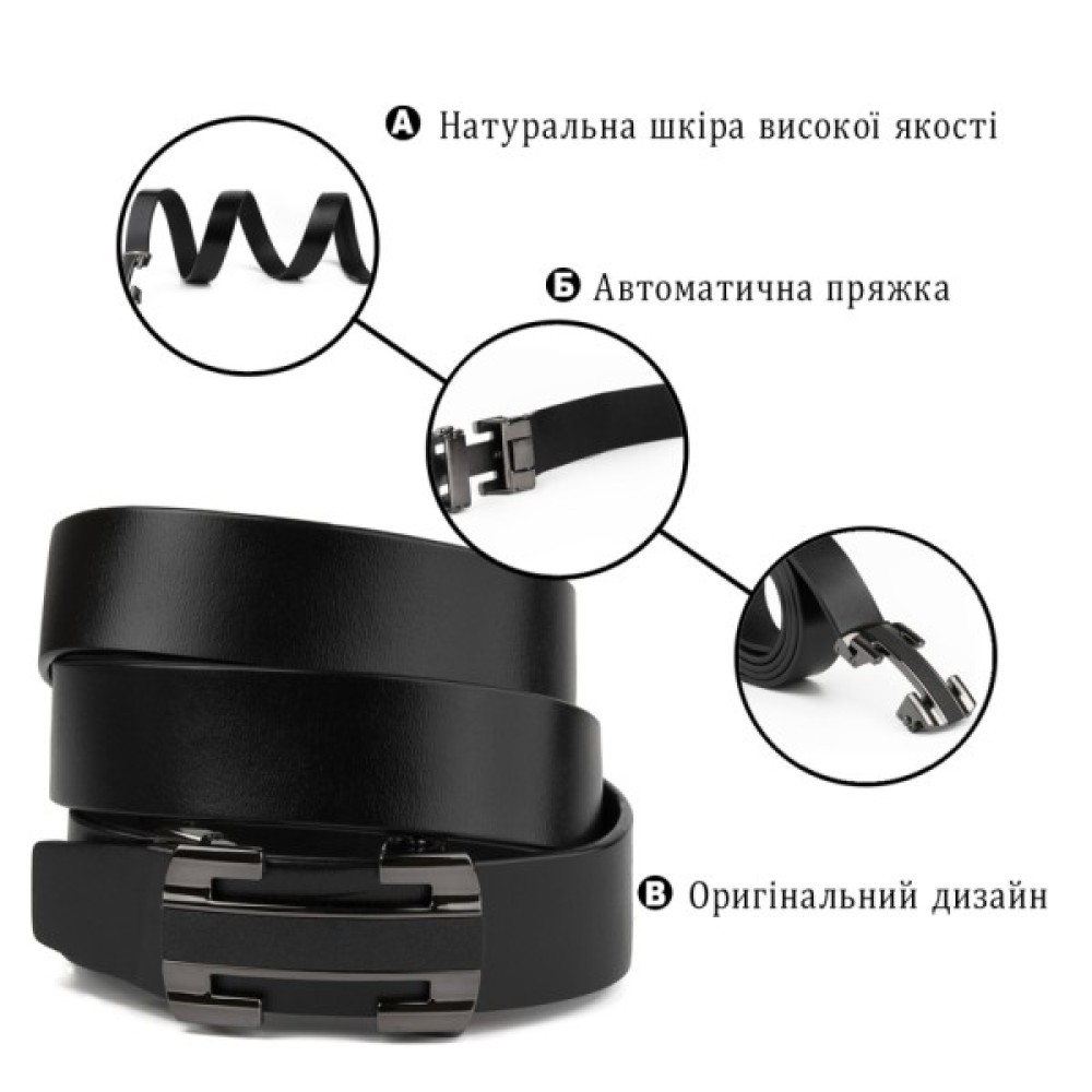 Шкіряний чоловічий солідний ремінь класичного чорного кольору з автоматичною пряжкою у вигляді куточків, які створюють рамку.