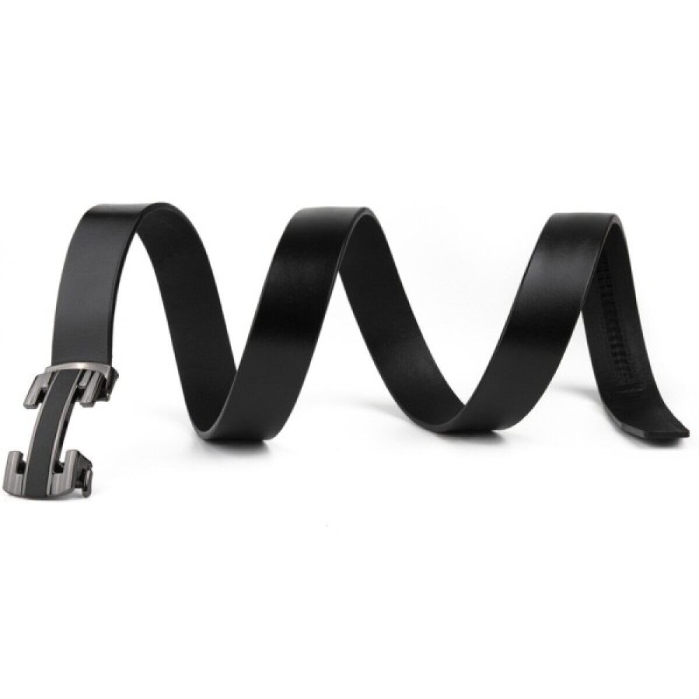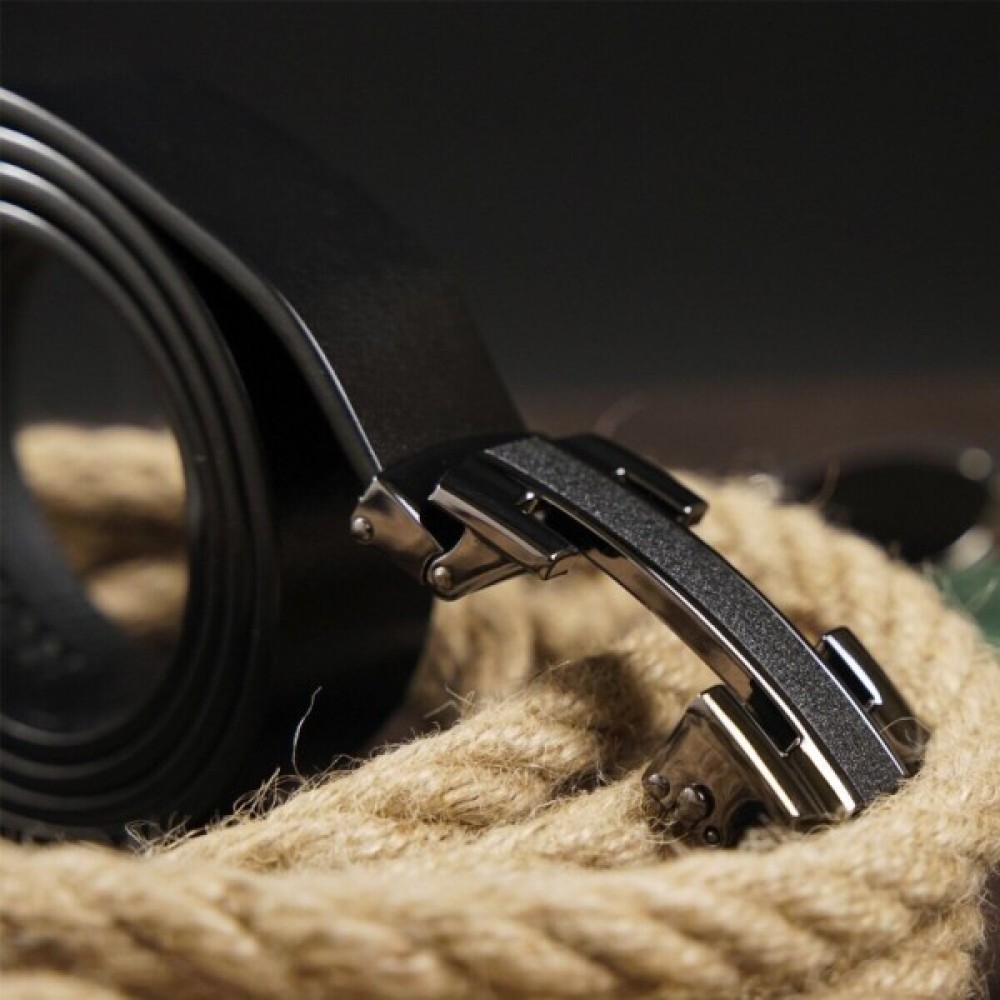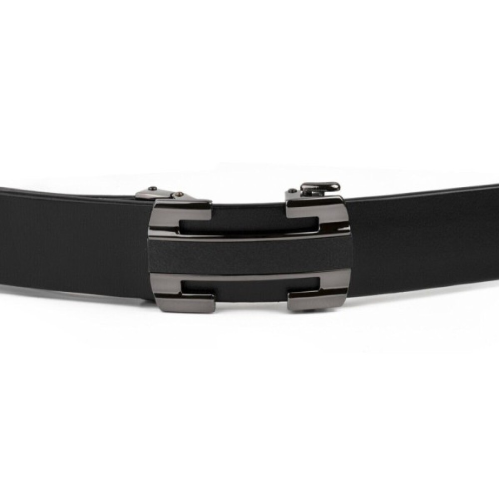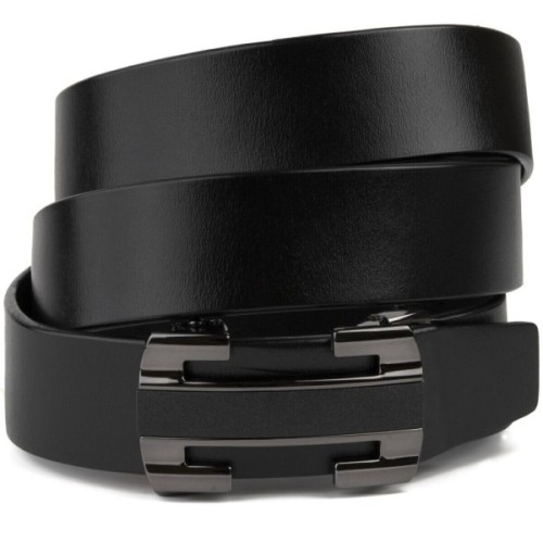 Шкіряний чоловічий солідний ремінь класичного чорного кольору з автоматичною пряжкою у вигляді куточків, які створюють рамку.