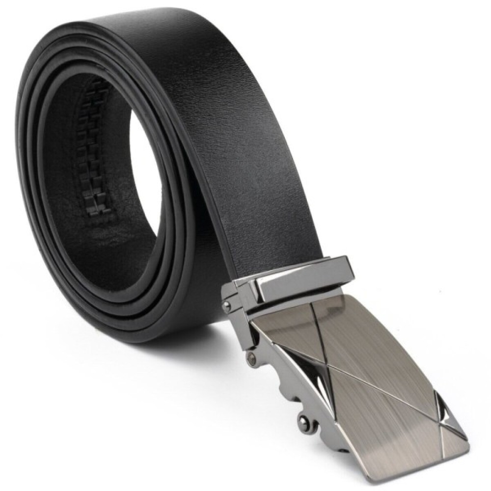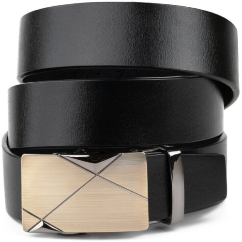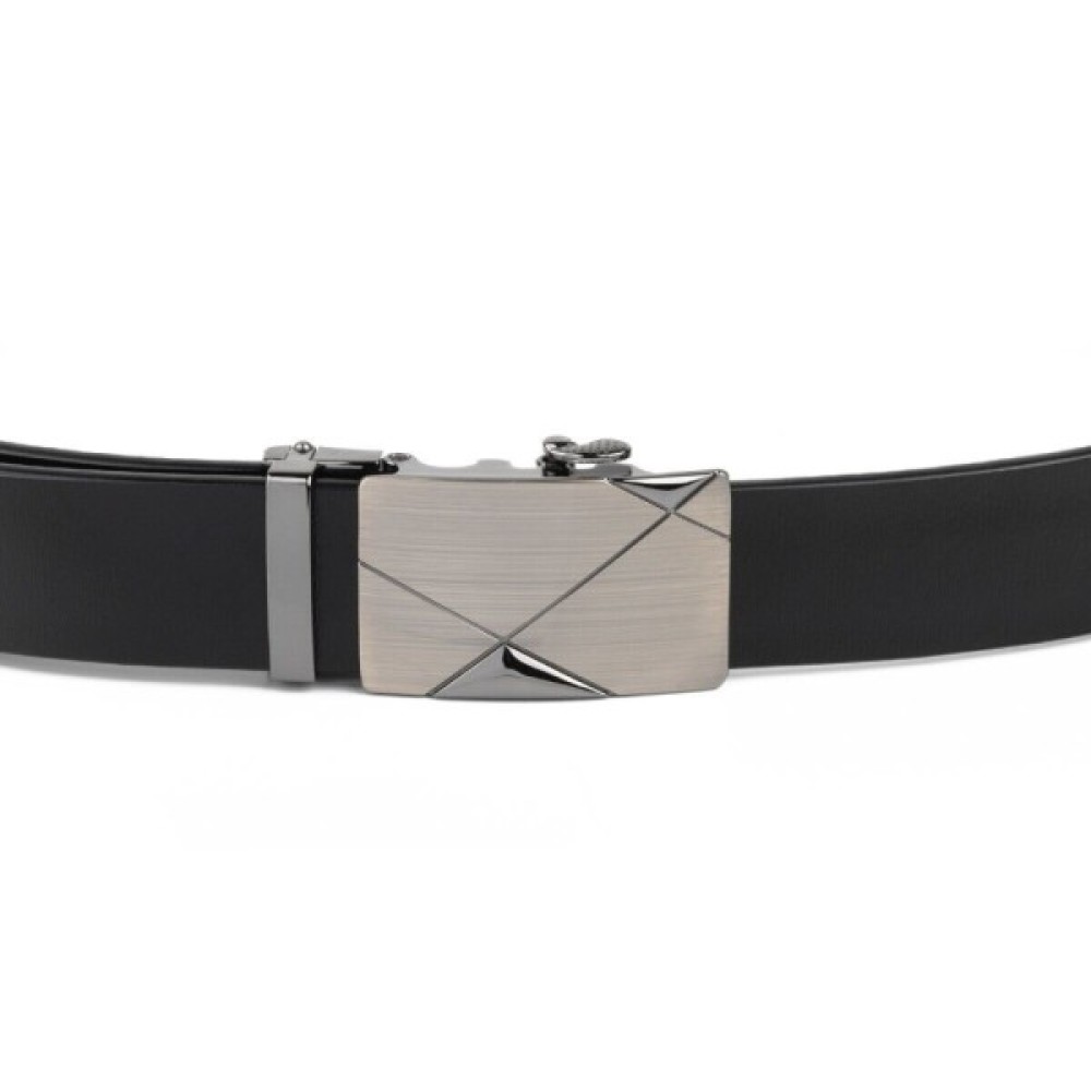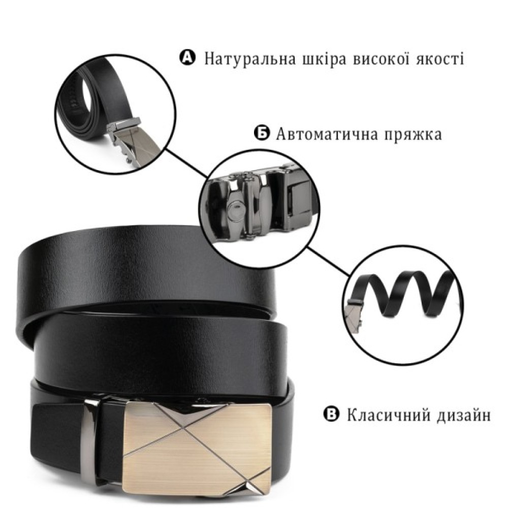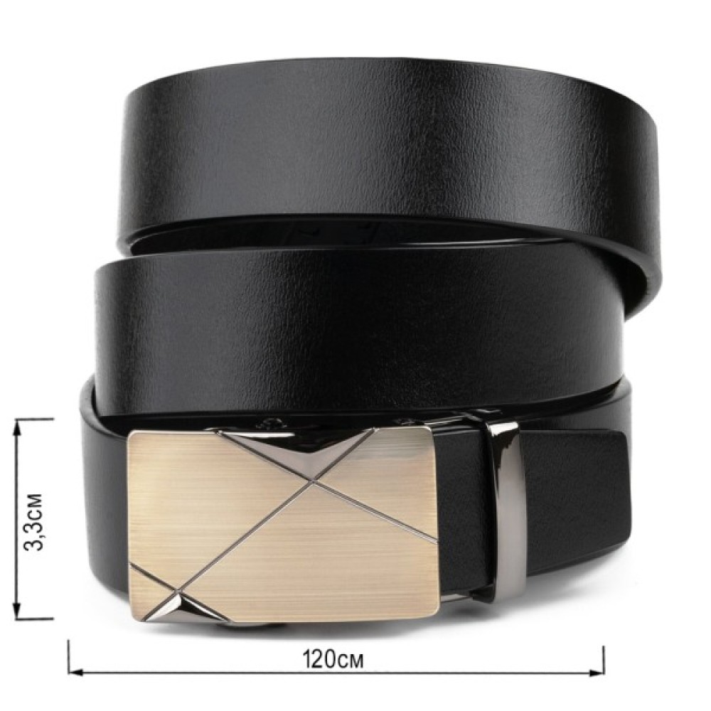 Чорний чоловічий ремінь з автоматичною пряжкою. Виріб виготовлено з натуральної шкіри найвищої якості. Доповнено ремінь оригінальною пряжкою з діагональним візерунком. Пряжка виконана з якісного сплаву.