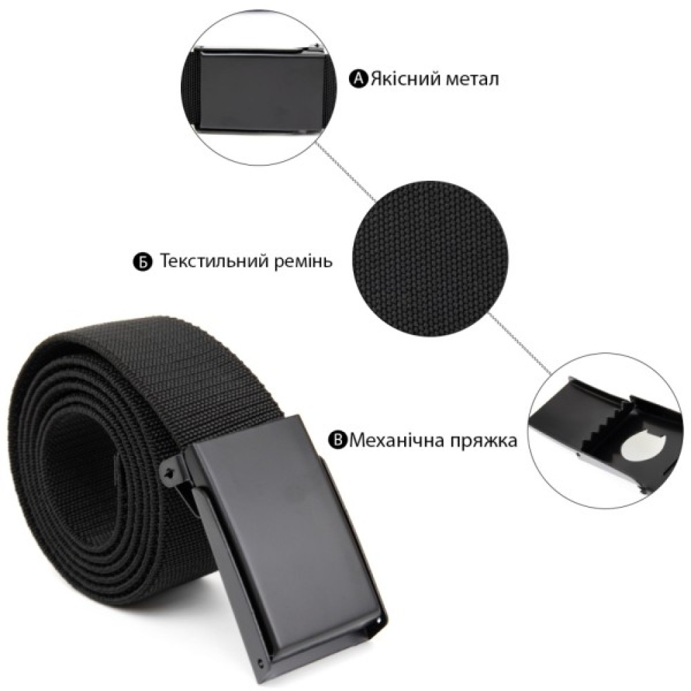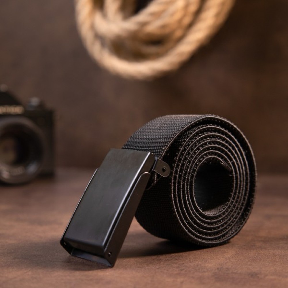 Тканинний чоловічий ремінець на кожен день класичного чорного кольору. Виріб довговічний. Тканина тягнеться і не шарується. Доповнено ремінь якісною пряжкою з щільного сплаву прямокутної форми і автоматичного типу. Ширина ременя середня і добре підійде під джинси і брюки. Текстильний ремінець стане непоганою альтернативою шкіряного ременя. Текстильний ремінь прекрасно підійде на подарунок чоловікові.