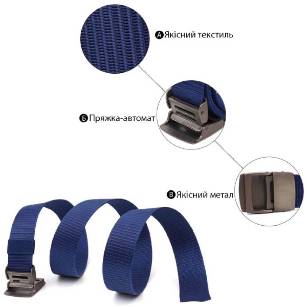 Виріб добротний, тканина щільна - не тягнеться. Доповнено ремінь якісною металевою пряжкою-автомат. Ширина ременя середня та добре підійде під джинси. Текстильний ремінець стане чудовою альтернативою шкіряному ременю.