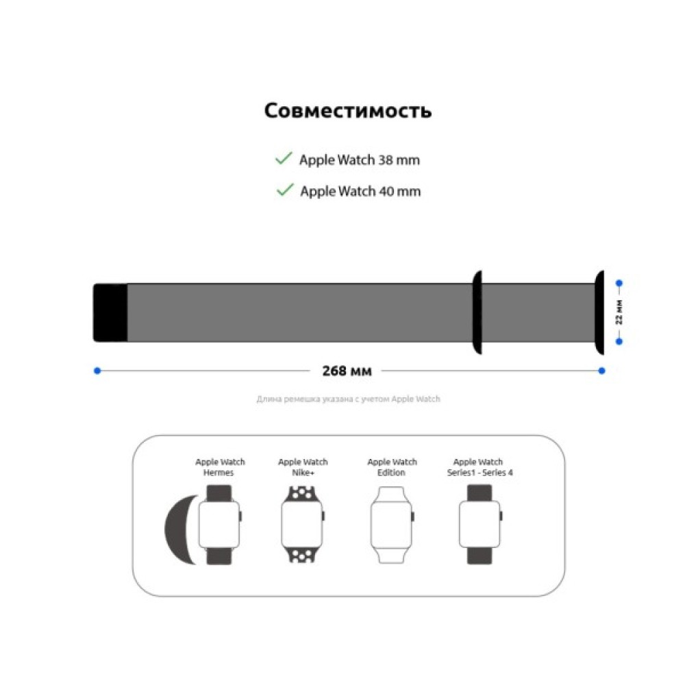 Сумісність: Apple Watch 2; Apple Watch 3; Apple Watch 4; Apple Watch 5; Apple Watch 6; Apple Watch 7; Apple Watch 8; Apple Watch 9; Apple Watch SE (2020); Apple Watch SE (2022); Apple Watch SE (2023)