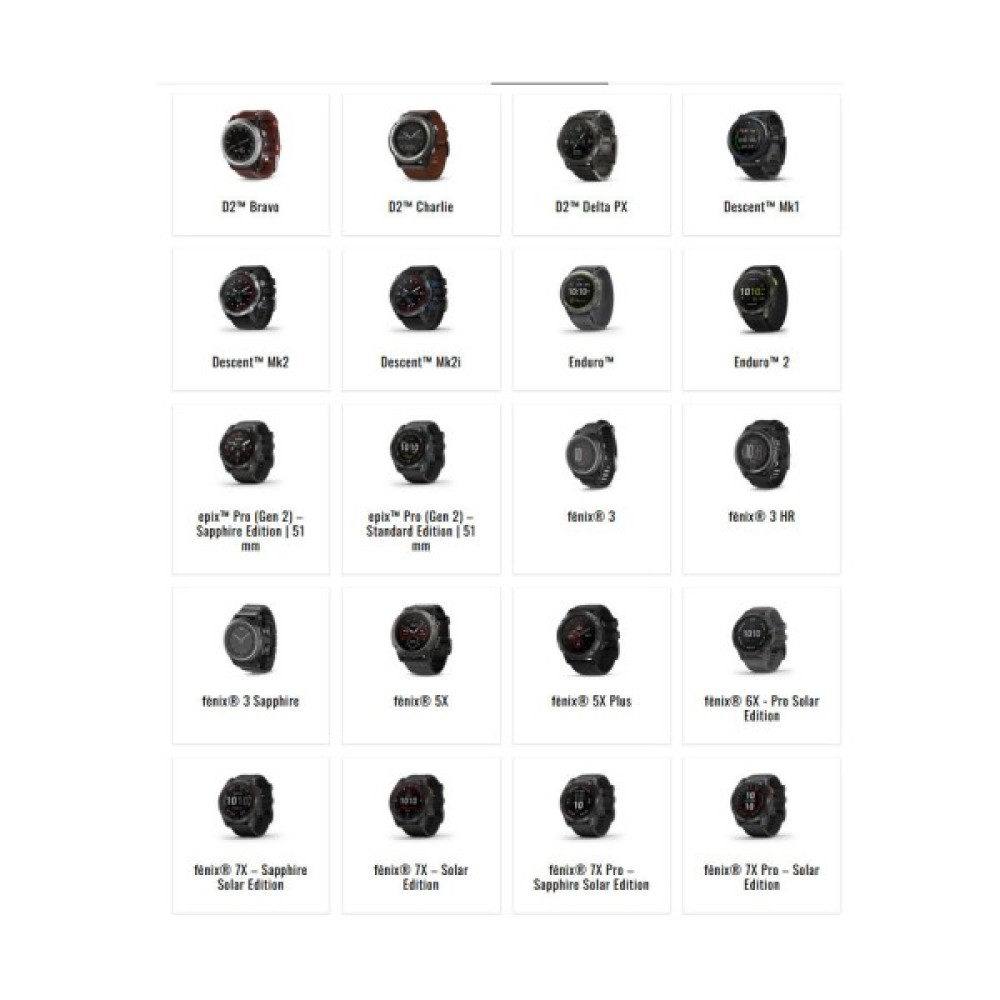 Garmin Enduro; Garmin Tactix Bravo; Garmin Tactix Charlie; Garmin Tactix Delta Sapphire; Garmin Descent Mk1; Garmin D2 Bravo; Garmin D2 Charlie; Garmin Descent Mk2i; Garmin Descent Mk2; Garmin Enduro 2; Garmin D2 Delta PX; Garmin Epix Pro (Gen 2); Garmin Instinct 2S; Garmin Fenix 3 HR; Garmin Quatix 3; Garmin Fenix 3; Garmin Fenix 5X; Garmin Fenix 5X Plus; Garmin Fenix 6X Pro; Garmin Quatix 6X Solar; Garmin Fenix 7X; Garmin Quatix 7X Solar; Garmin Fenix 7X Pro; Garmin Foretrex 601; Garmin Foretrex 701 Ballistic; Garmin Foretrex 801; Garmin Foretrex 901