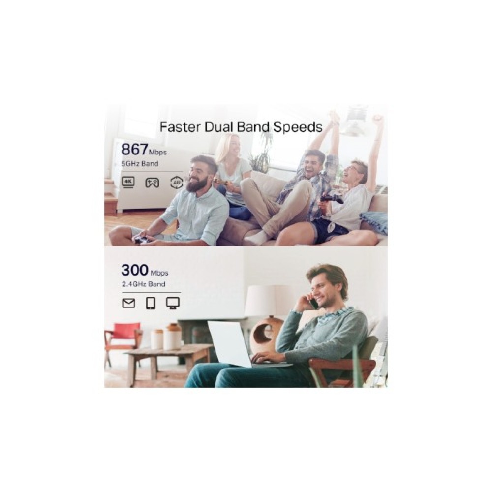 Два Wi-Fi діапазони RE330 дозволяють підключити більше пристроїв одночасно. Використовуйте діапазон 2,4 ГГц (до 300 Мбіт/с) для роботи з поштою та перегляду веб-сторінок, а діапазон 5 ГГц (до 867 Мбіт/с) для онлайн-ігор та HD-стримів.