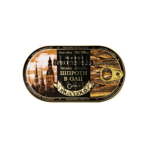 Шпроти в оливковій олії «Ризьке Золото» – це відбірна балтійська кілька виготовлена за внутрішнім Золотим Стандартом Якості, який передбачає традиційну технологію приготування шпрот – натуральне копчення на вільховій стружці. Для оливкової серії підприємство використовує ексклюзивну оливкову олію сорту першого віджиму – Extra Virgin, яку постачає з Греції. Перед копченням риба дефростується, сортується по розміру на спеціальні прути рамки спеціальної вагонетки. Риба з вагонеткою проходить копчення у автоматичній коптильній камері. Комп’ютерне управління контролює рівень копчення та димності шпротів, що дозволяє досягти ідеального копченого смаку. Копчення шпрот «Ризьке Золото» проходить класичним способом у диму з натуральної щепи вільхи. Для виготовлення щепи підбирається якісна деревина вільхи. Після копчення шпроти у стерильних умовах дбайливо викладаються косичкою турботливими руками. Наповнені рибою банки заливаються оливковою олією, додається сіль. Закриті баночки проходять процес стерилізації в автоклаві. Консерви етикетуються та маркуються охолодженими. Шпроти в оливковій олії «Ризьке Золото» мають золотистий колірта унікальний смак натуральної прокопченої риби та томлених запашних оливок.Щоб споживач міг оцінити всю красу традиційних класичних шпротів, в скляну банку відбирають рибку не більше 8 см за розміром.