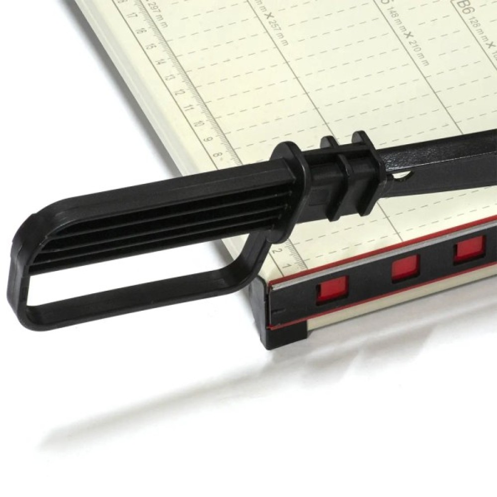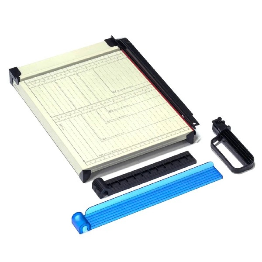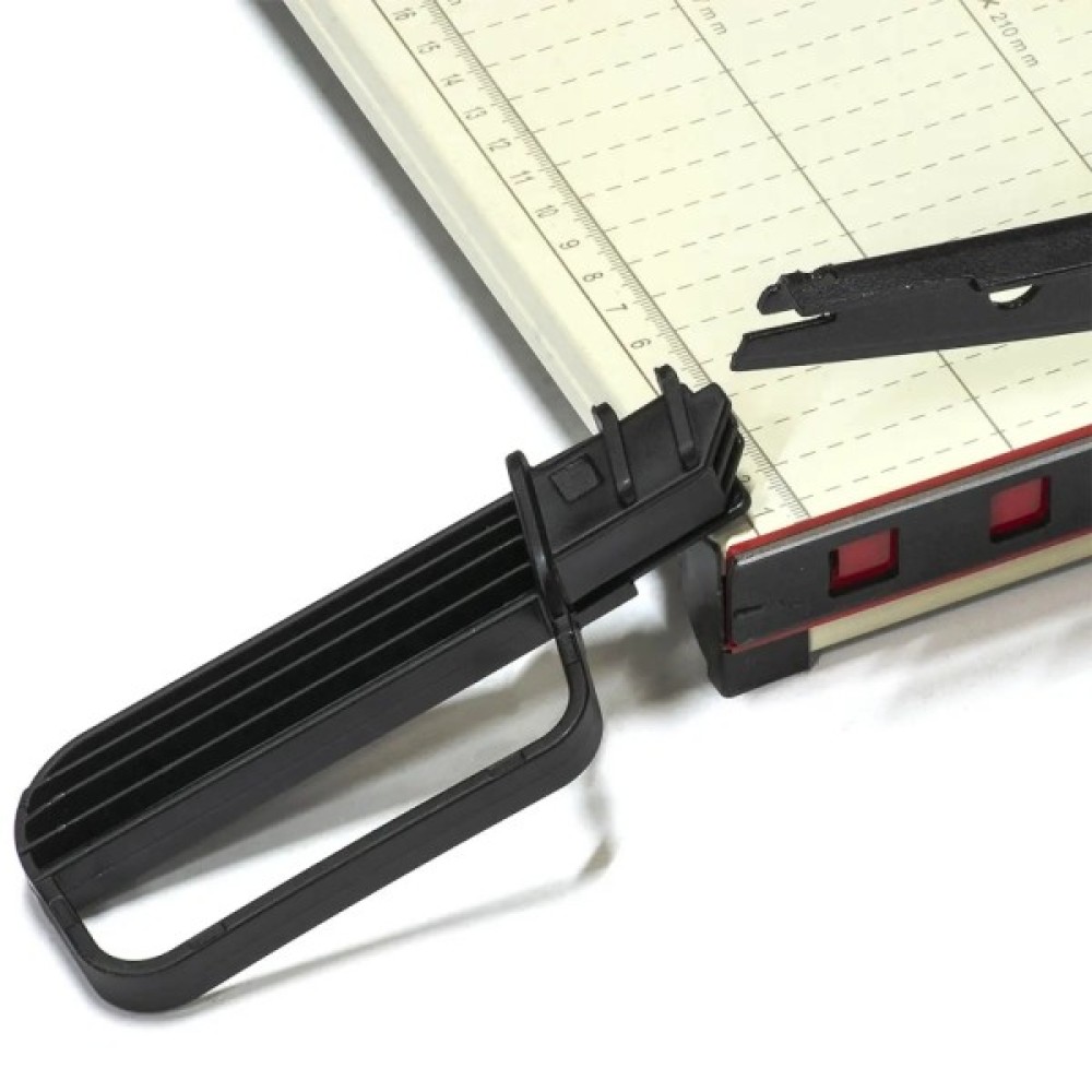 Різак шабельного типу для підрізування паперу. Призначений для офісної та домашньої поліграфії. Довжина різу - 297 мм. Товщина стопи - 1,2 мм. На столі нанесена розмітка стандартних форматів. Лінійка-позиционер для більш точного і зручного виставлення лінії різу. Ручка ножа знімна. Металева основа різака, не деформується з часом, завжди тримає прямий і рівний різ.