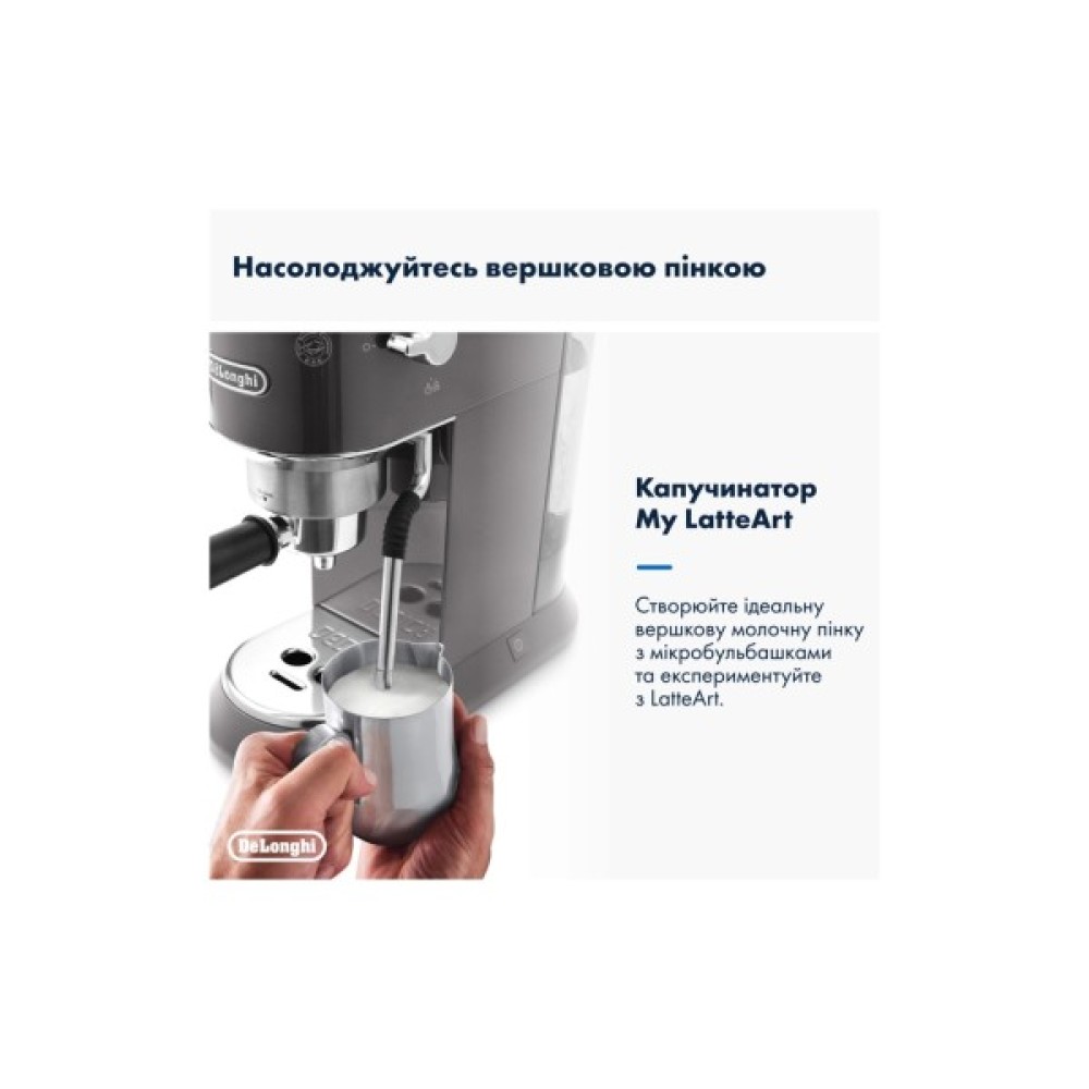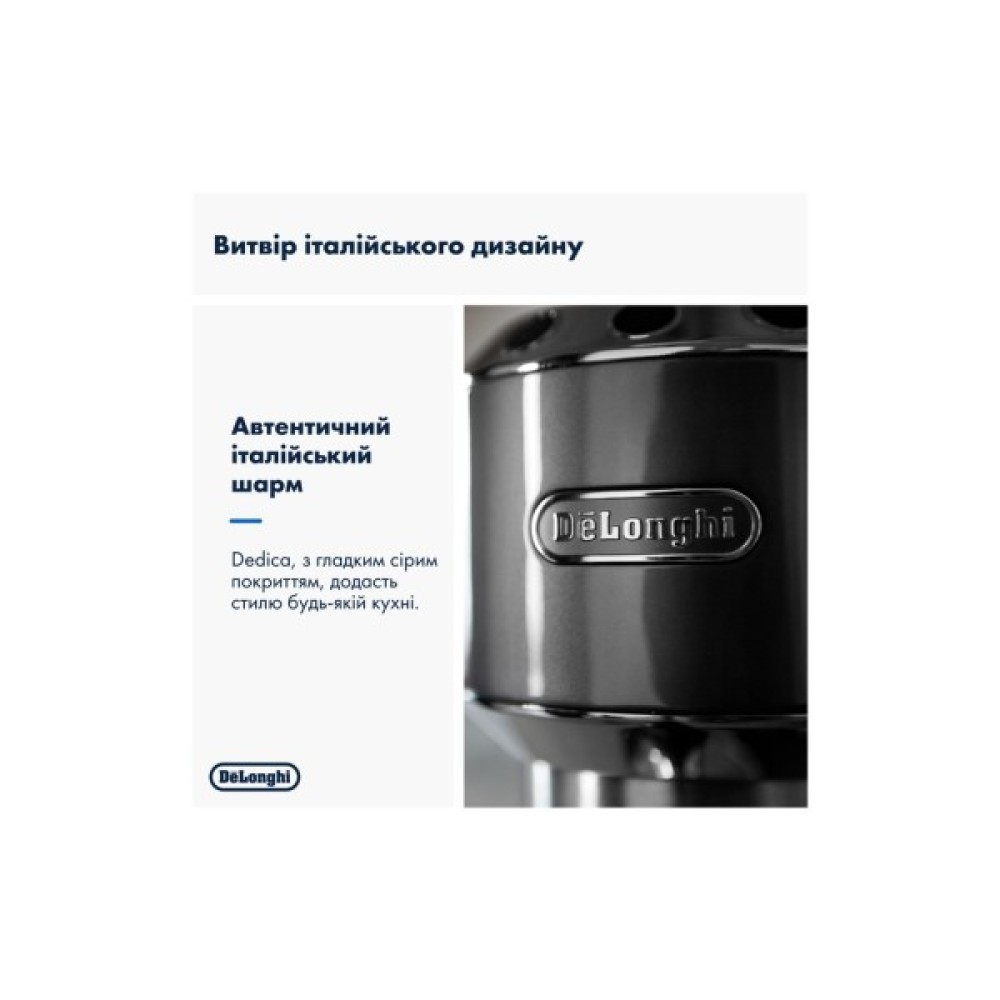 Dedica Arte поєднує в собі квінтесенцію італійського дизайну з можливістю створення ідеальної кави, укладеної в елегантну форму кавоварки шириною всього 15 см. Незважаючи на компактні розміри, вона характеризується високою ефективністю завдяки електронному контролю температури та швидкому нагріванню, яке займає всього 40 секунд. Нова насадка для спінювання молока My Latte Art дозволяє готувати смачні кавові напої з молоком та пишною піною, яка подається при оптимальній температурі завдяки функції підігріву чашки. Стильний та компактний дизайн у блискучому металевому корпусі сірого відтінку з матовим покриттям і тисненим логотипом роблять Dedica Arte окрасою будь-якої кухні.