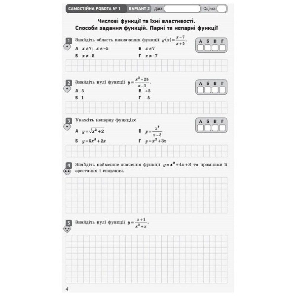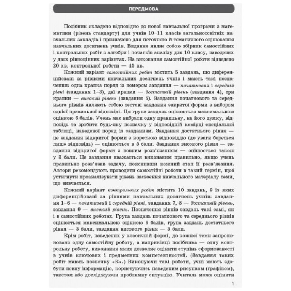 Зошит відповідає вимогам нової навчальної програми з математики (рівень стандарту) для учнів 10–11 класів загальноосвітніх навчальних закладів і призначений для поточного й підсумкового оцінювання навчальних досягнень учнів з алгебри і початків аналізу.