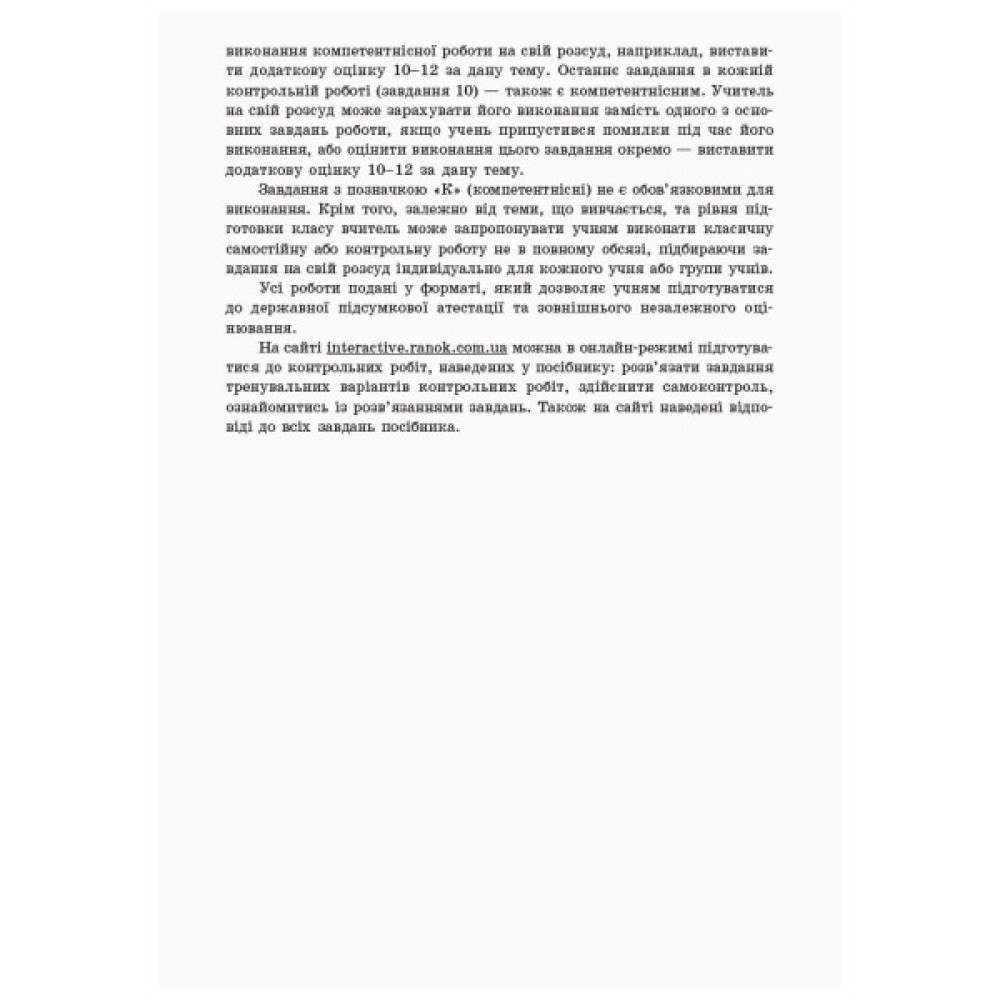 На сайті interactive.ranok.com.ua учні можуть в онлайн-режимі підготуватися до контрольних робіт, розв’язати завдання тренувальних варіантів, здійснити самооцінювання, ознайомитись із розв’язаннями завдань. Учитель може отримати інформацію про результати проходження тестування учнями.