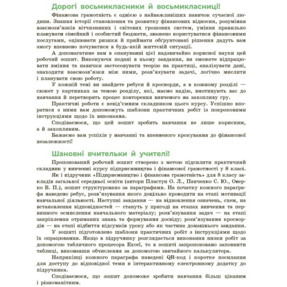 Робочий зошит є частиною навчально-методичного комплекту «Підприємництво і фінансова грамотність. 8 клас», створеного на основі підручника Олексія Пластуна, Сергія Панченка, Володимира Оверка. Зошит містить завдання й задачі, що допоможуть відпрацювати практичні навички, набуті під час опанування навчального матеріалу, ребуси, кросворди і комікси для мотивації навчальної діяльності та ефективного повторення, шаблони практичних робіт із покроковим описом виконання для набуття практичного досвіду в ситуаціях, наближених до реального життя.