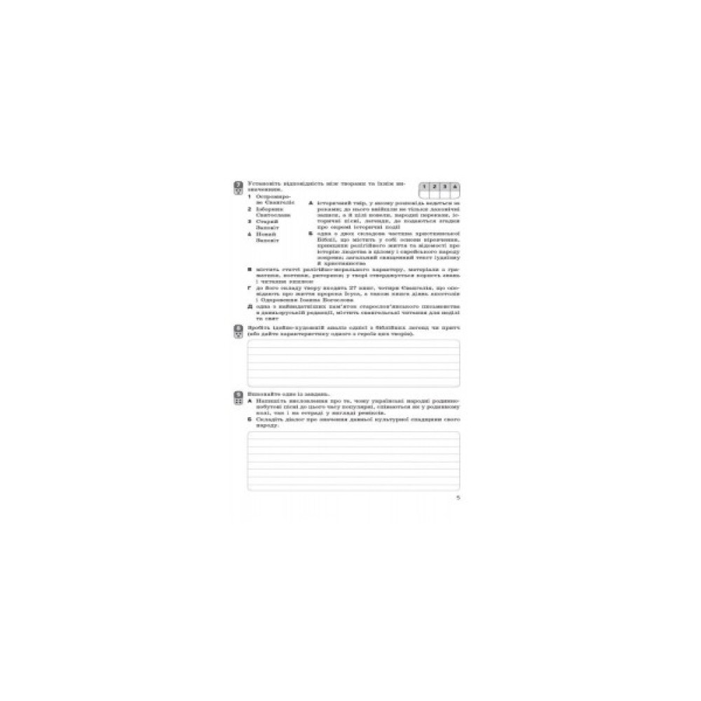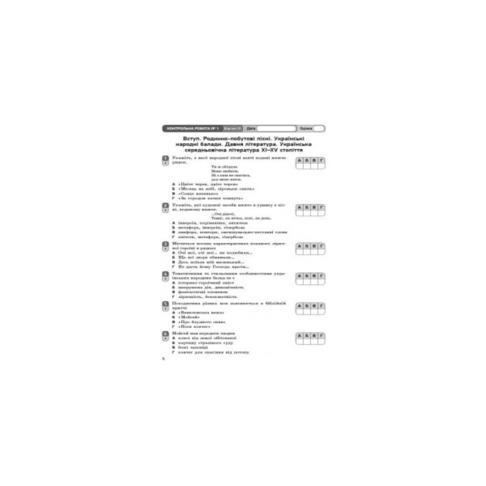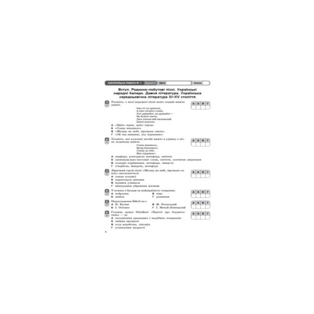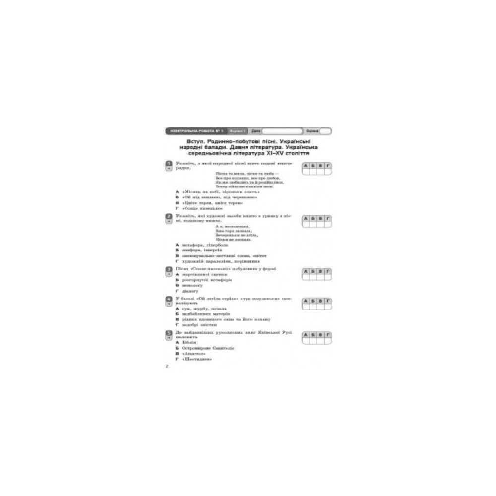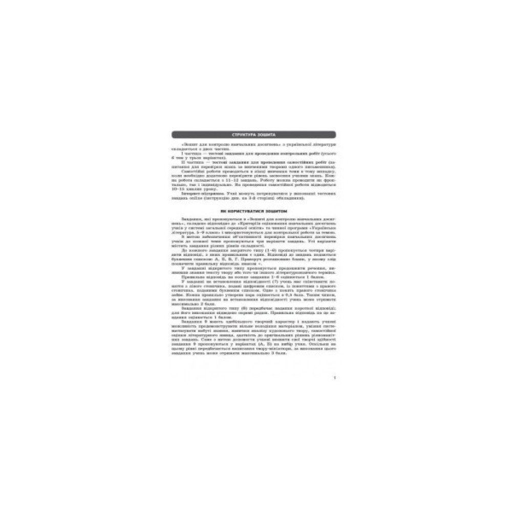 Зошит складається з двох частин: завдання для контрольних робіт з української літератури, складені відповідно до «Критеріїв оцінювання навчальних досягнень учнів у системі загальної середньої освіти»; тестові завдання для проведення самостійних робіт із теми, що охоплює твори одного письменника.