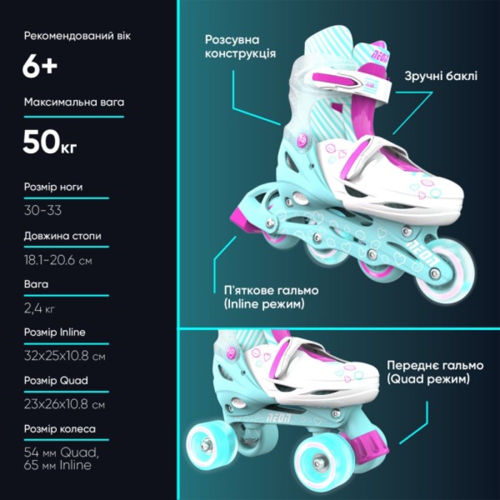 Це набір 2в1 включає в себе відразу 2 типу роликових ковзанів Inline (Лінійні, 4 колеса в ряд.) + Quad (по 2 колеса розташовані поперечно). Саме завдяки варіативності набір Neon Combo Skates буде зручний і корисний для дитини, якій тільки предстоїть освоїти роликові ковзани. Завдяки можливості варіативного вибору типу роликів в даній моделі, навчання буде проходити найбільш продуктивно і дозволить безпечно освоїти роликиі використовуючи переваги кожного з типів.