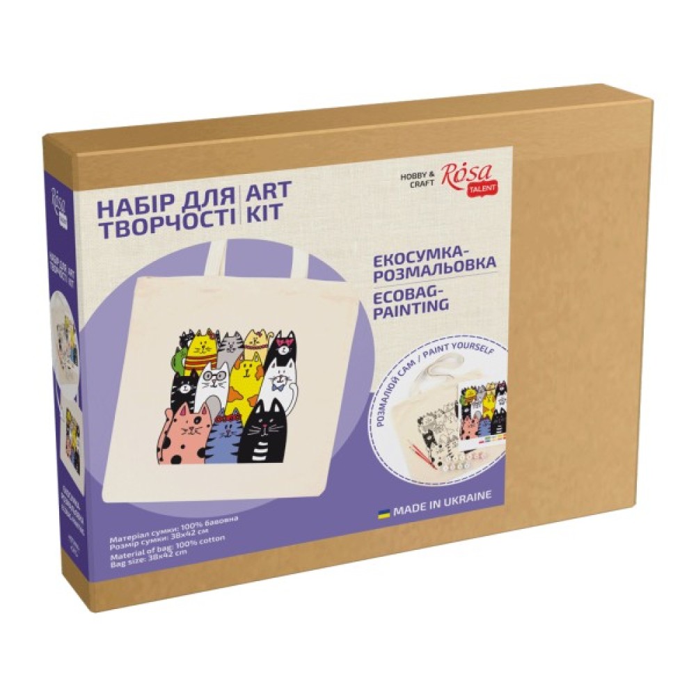екосумка з нанесеним контуром малюнка; акрилові фарби rosa talent для розпису тканин; художні кисті; схема кольорів; прозорий пакет; етикетка з покроковою інструкцією на обороті