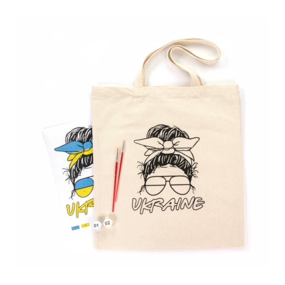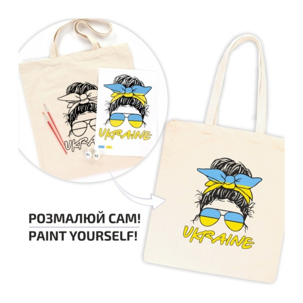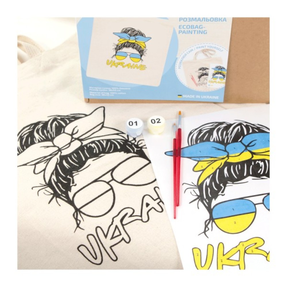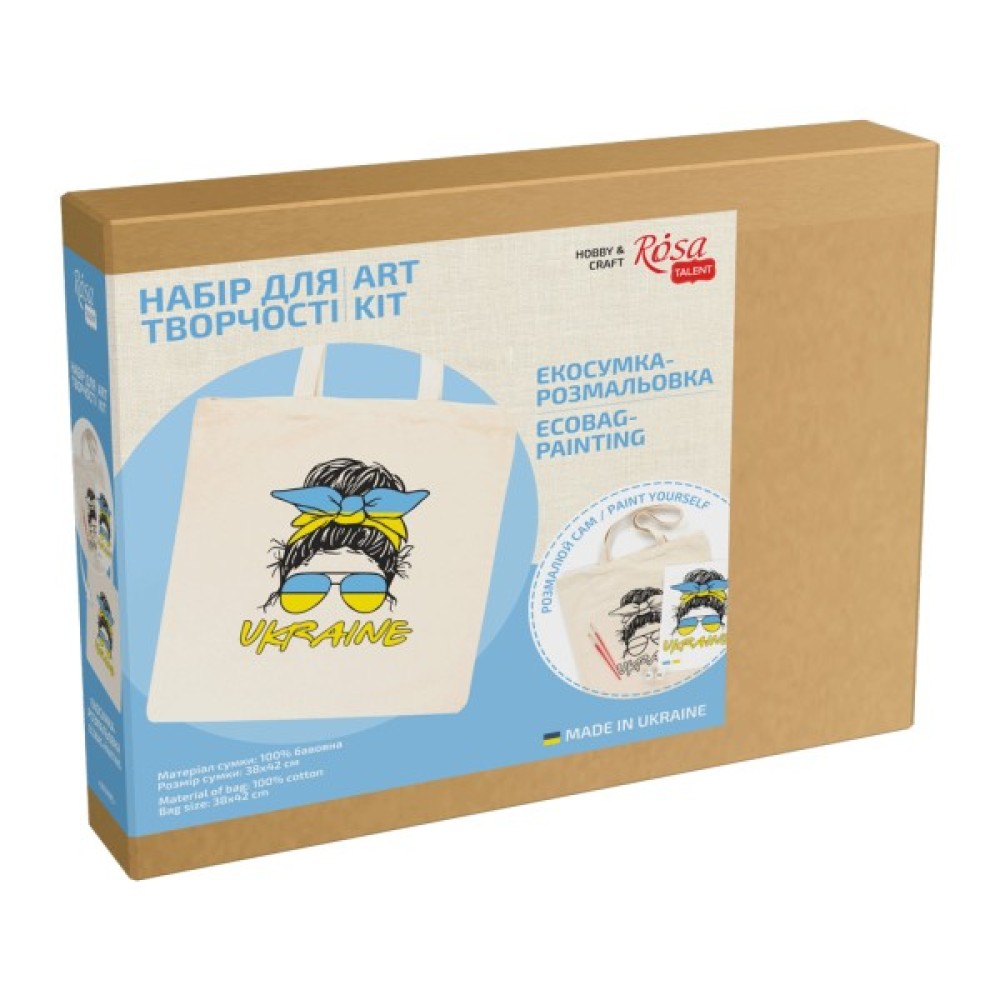 екосумка з нанесеним контуром малюнка; акрилові фарби rosa talent для розпису тканин; художні кисті; схема кольорів; прозорий пакет; етикетка з покроковою інструкцією на обороті