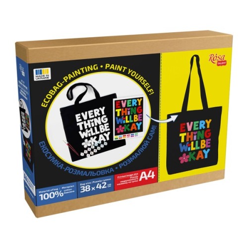 - Комплектація: екосумка, фарби акрилові для тканин ROSA Talent, якісні художні пензлі, кольорова схема, прозорий пакет, етикетка з покроковою інструкцією на звороті