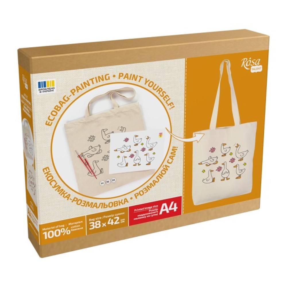 екосумка з нанесеним контуром малюнка, акрилові фарби rosa talent для розпису тканин, художні пензлі, колірна схема, прозорий пакет, етикетка з покроковою інструкцією на обороті