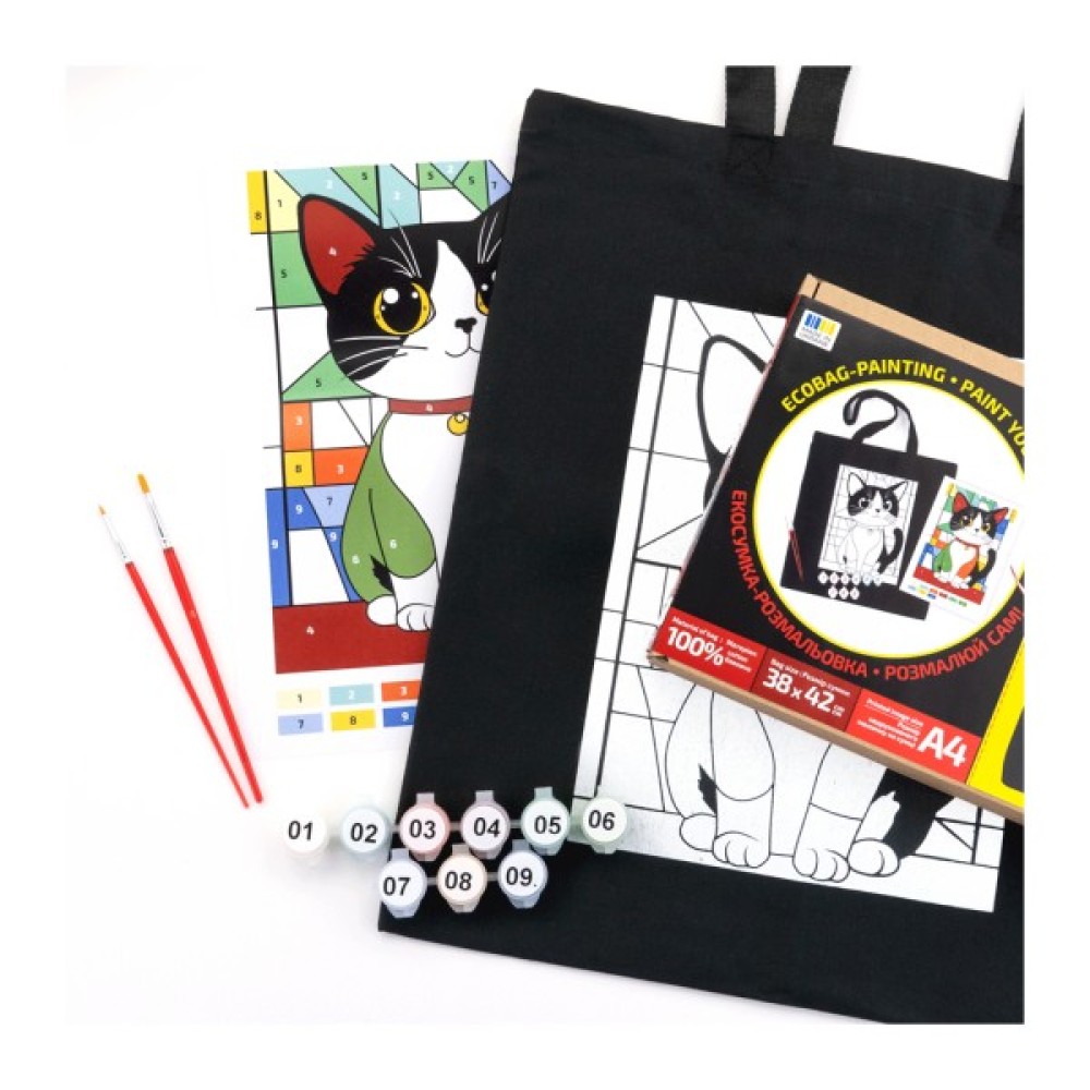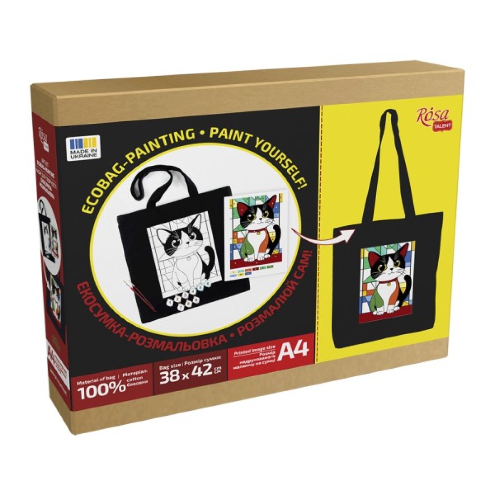 Екосумка ROSA Talent– виготовлена зі 100% бавовняної тканини чорного кольору. Щільний якісний матеріал та надійна фіксація ручок дозволяє витримувати навантаження вагою до 15 кг. Розпис екосумки ROSA Talent - надзвичайно захоплюючий та водночас легкий процес, адже контури малюнку вже нанесені на основу. Розписана власноруч сумка стане яскравим стильним та практичним аксесуаром, що доповнить щоденний образ! Вміст набору: 1. Екосумка чорна з нанесеним контуром малюнку: - матеріал: 100% бавовна; - щільність: 200г/м2; - розмір сумки: 38х42 см; . - розмір ручок: 60х2,5 см; 2. Фарби акрилові для тканин ROSA TALENT 3. Пензлі художні 4. Кольорова схема 5. Прозорий пакет 6. Етикетка з покроковою інструкцією на звороті Покрокова інструкція розпису сумки: 1. Підготуй усі складові. 2. Помісти пакет всередину сумки, для запобігання проходження фарби на зворотню сторону. 3. Розфарбуй малюнок, керуючись зображенням на кольоровій схемі. Залиш виріб до повного висихання на 48 годин. 4. Зафіксуй малюнок праскою без пари, при t 30-40 С, через папір або бавовняну тканину. Час прасування однієї ділянки 5хв. Для досягнення яскравості та насиченості малюнку, рекомендуємо нанести фарбу в 2-3 шари.Характеристики