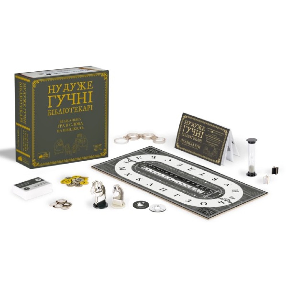 Комплектація гри вражає своєю якісністю та увагою до деталей. У набір входить ігрове поле, що стане ареною ваших інтелектуальних змагань, 60 карт категорій, 2 фігурки бібліотекарів, які символізують прогрес вашої команди, 20 плиток із літерами для утруднення завдань, 12 жетонів книжок та пісочний годинник для контролю часу. Все це разом створює потужну атмосферу інтриги та змагання.