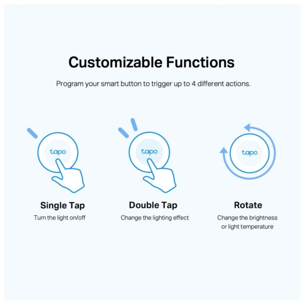 • Розумні дії – Керуйте кількома лампами, електронікою та іншими розумними пристроями Tapo за допомогою кнопки та налаштовуйте їх.