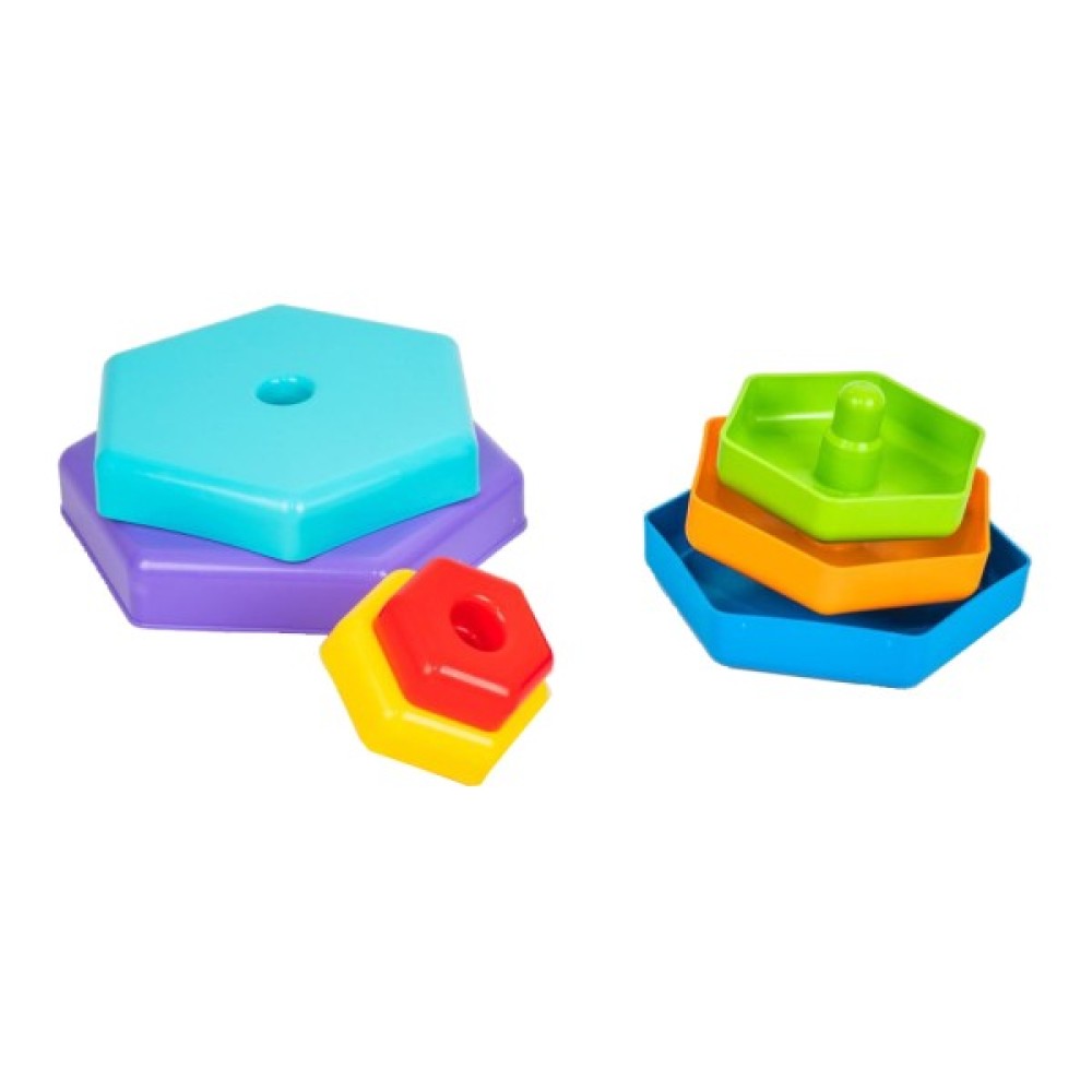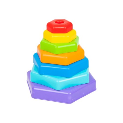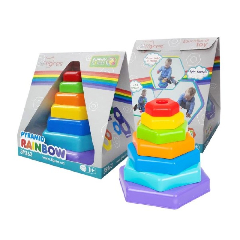 Іграшка складається із 7 елементів різного розміру та кольору, які накладаються один на одного. Елементи пірамідки мають приємну поверхню, їх зручно тримати в маленьких ручках. Знімаючи та накладаючи елементи одне на одне, малюк знайомиться з формами та розмірами предметів, вчиться просторово мислити, розпізнавати кольори, вивчає кількісну лічбу.