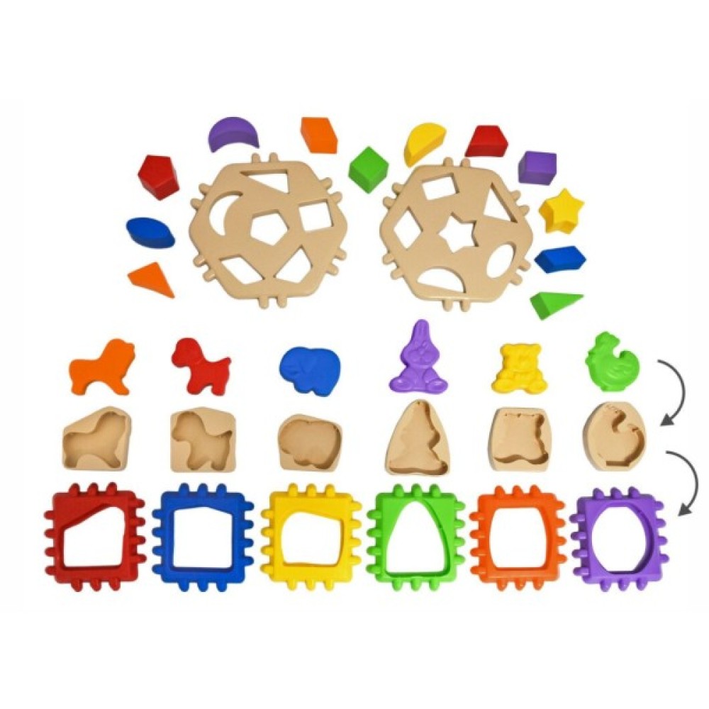 Іграшка складається із 6-ти  бічних сторін з фігурами різної форми, в які, в свою чергу, вставляються фігурки тварин. З 2-х стінок із отворами різної форми та 12 геометричних деталей..
