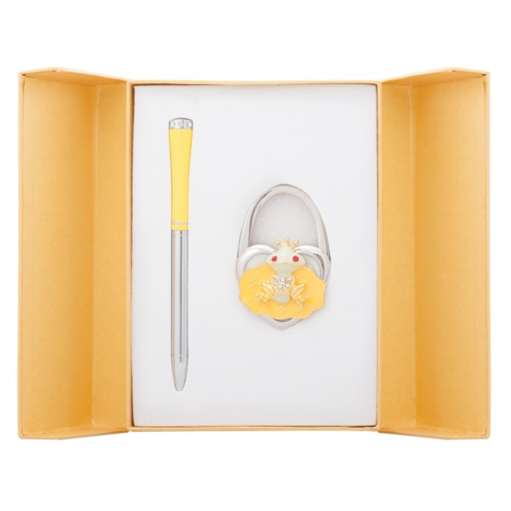 Langres Faity Tale - набір, який припаде до душі романтичним і творчим натурам. До складу набору входять кулькова ручка і гачок для сумки. Металевий корпус ручки надає їй стильний вигляд.Сріблястий відтінок доповнений яскравим кольором, що виглядає досить ефектно. Кристали роблять ручку не тільки функціональним виробом, а й вишуканим аксесуаром.Після використання стрижень можна замінити, підходяща модель для заміни - cross LS.499000. Гачок для сумки, який кріпиться до столу, можна носити з собою, щоб завжди було куди повісити сумку, наприклад, в кафе. Гачок виконаний у вигляді казкової жаби, яка ось-ось перетвориться на принца.Набір упакований в красивий футляр, перев'язаний стрічкою.