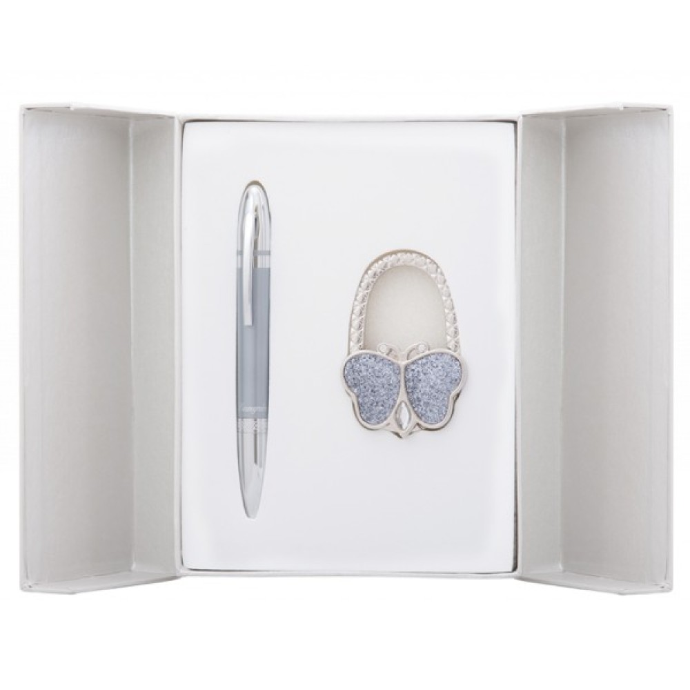 Langres Lightness - набір, який припаде до смаку як діловим жінкам, так і любителькам незвичайних аксесуарів. До його складу входять ручка і гачок для сумки. Ручка виконана в класичному стилі: металеву поверхню прикрашає геометричний візерунок.Для неї підійде стрижень parker LS.499001. Гачок для сумки - оригінальний аксесуар, який підкреслить романтичну натуру його власниці. Виріб виготовлено у вигляді метелика, чиї крила приваблюють перламутровим блиском. Гачок зручно носити з собою, щоб при необхідності прикріпити його до столу і повісити на нього сумку.Набір упакований в красивий подарунковий футляр с декоративними елементами.