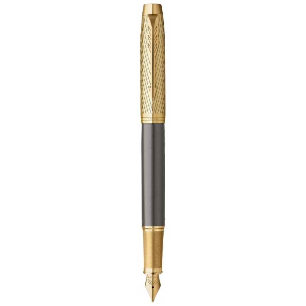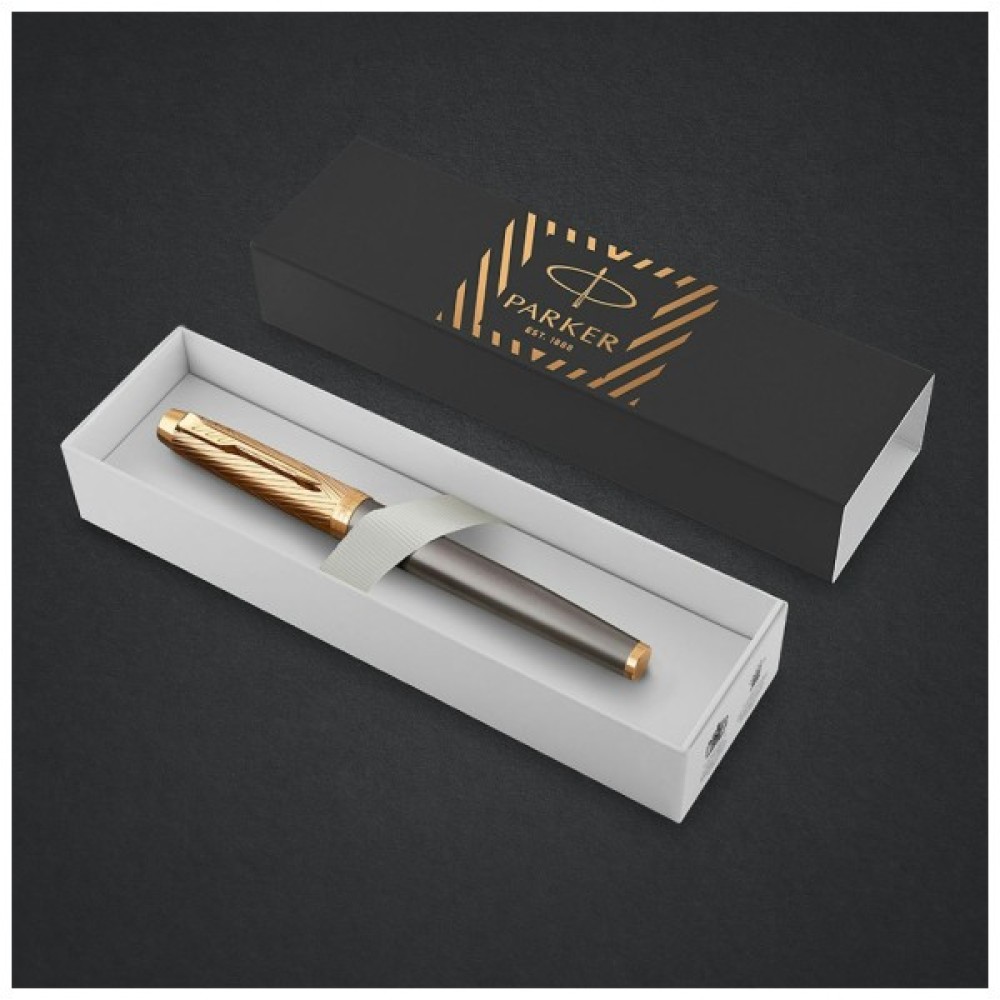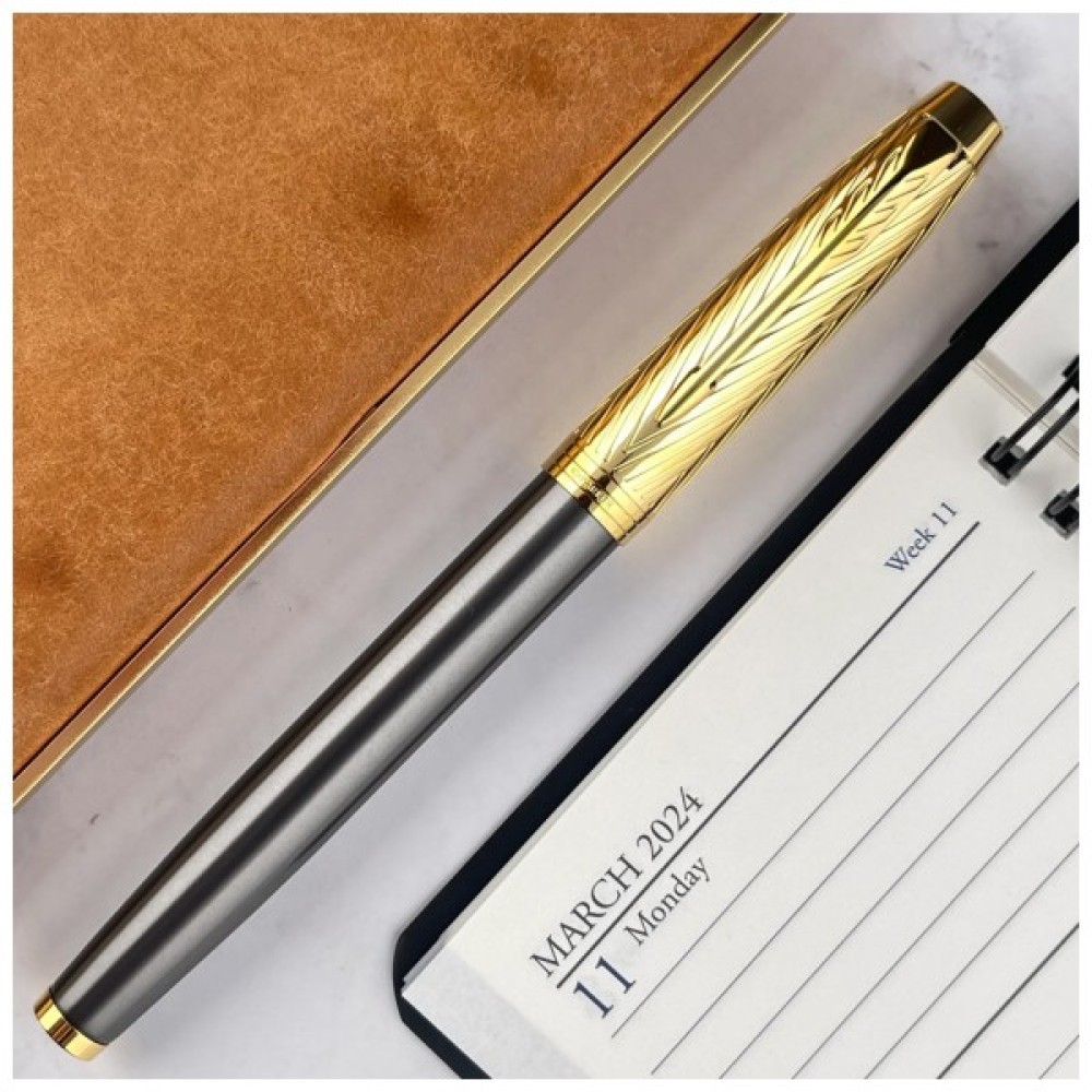 Поєднання сірого і золотого, яке відносно нещодавно стало фірмовим для Parker, сподобається чоловікам і жінкам. Позолочений ковпачок прикрашений хімічно витраченим візерунком: гравіювання на ковпачку повторює стрілку, яка символізує далекоглядне мислення Джорджа Паркера і його новаторський підхід до створення по-справжньому унікальних ручок. Затискач-стріла Parker та грип-секція також позолочені.