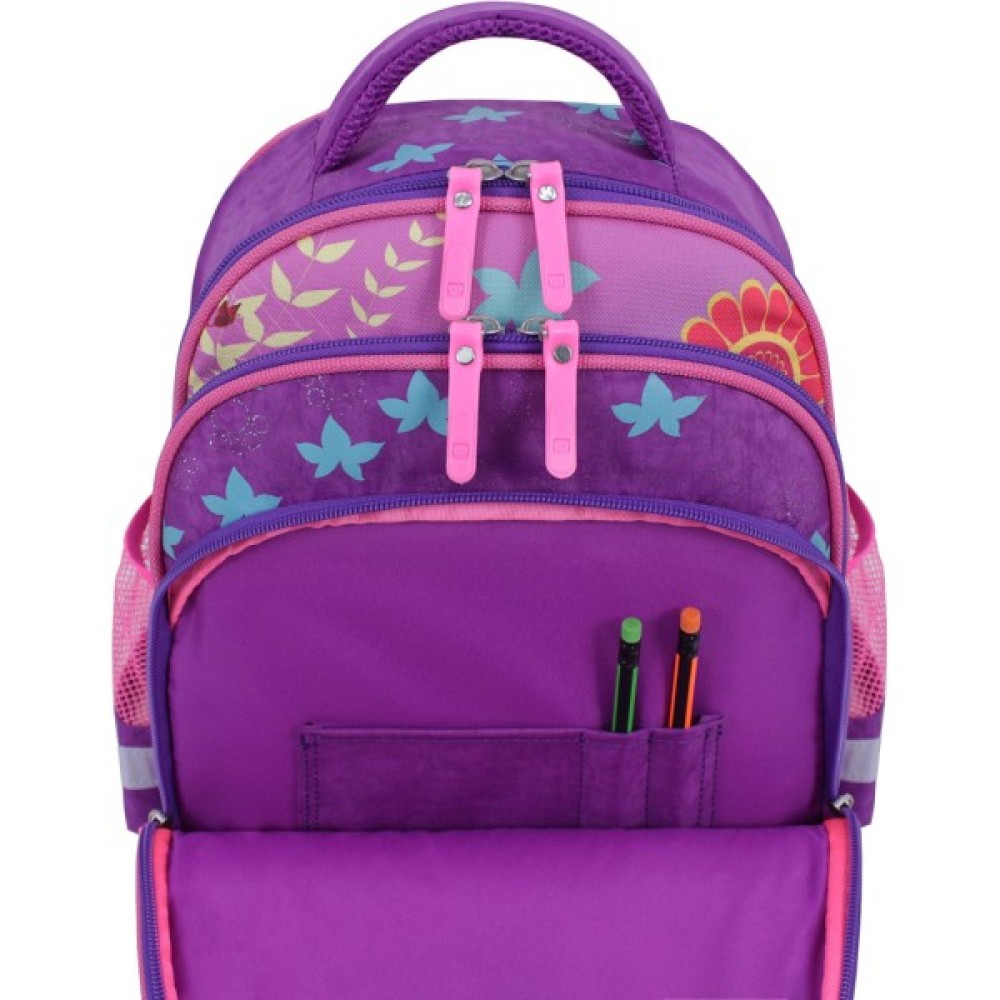Основне й найбільше відділення підійде для підручників і спортивної форми. Друга кишеня призначена для зошитів, блокнотів чи альбому для малювання, а відсік-органайзер спереду — для дрібних канцтоварів і пеналу. Бічні сітчасті кишені вмістять пляшку з водою та парасольку.