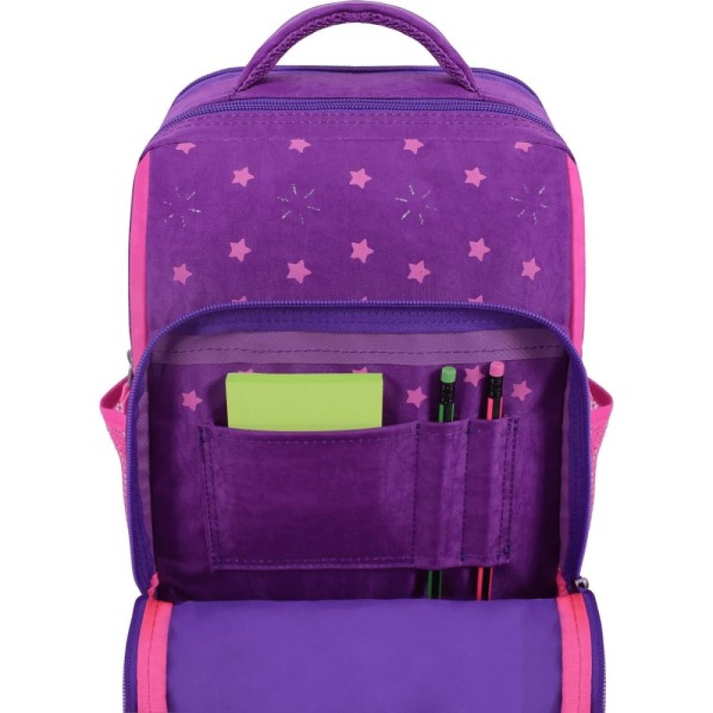 У рюкзаку — два просторі відділення на блискавці, де легко помістяться підручники, зошити або улюблені іграшки. Є також менше за розміром відділення з органайзером для канцтоварів — з ним можна обійтися без пенала. Спереду розташована зручна кишеня на блискавці для дрібниць — наприклад, телефону чи ключів. По боках — сітчасті кишені для пляшки з водою або термоса.