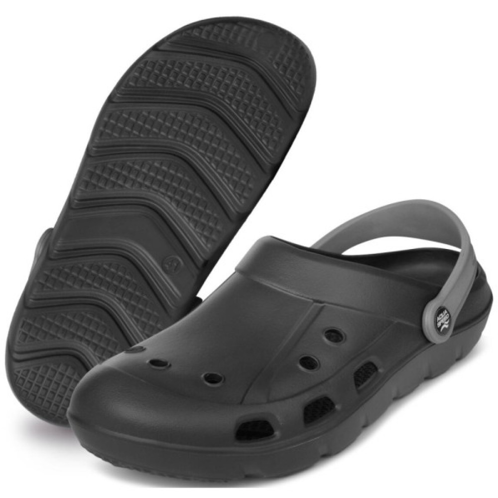 Має зручну внутрішню поверхню, що облягає стопу, і нековзку підошву, а п’ятковий ремінь не дає нозі вислизати з взуття.