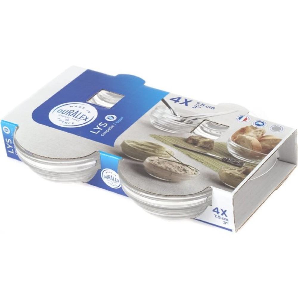 Набір із 4 штабелюваних мисок Lys діаметром 7,5 см ТМ Duralex. Скло Duralex на 100% гігієнічно, крім того, воно не є пористим, не містить свинцю, кадмію та Бісфенолу А. Загартоване скло Duralex є кращим вибором для індустрії громадського харчування. Воно спеціально рекомендоване для інтенсивного використання. Це й є основною причиною, чому його широко та активно використовують у сегменті Хорека (Кафе, Ресторани, Готелі).