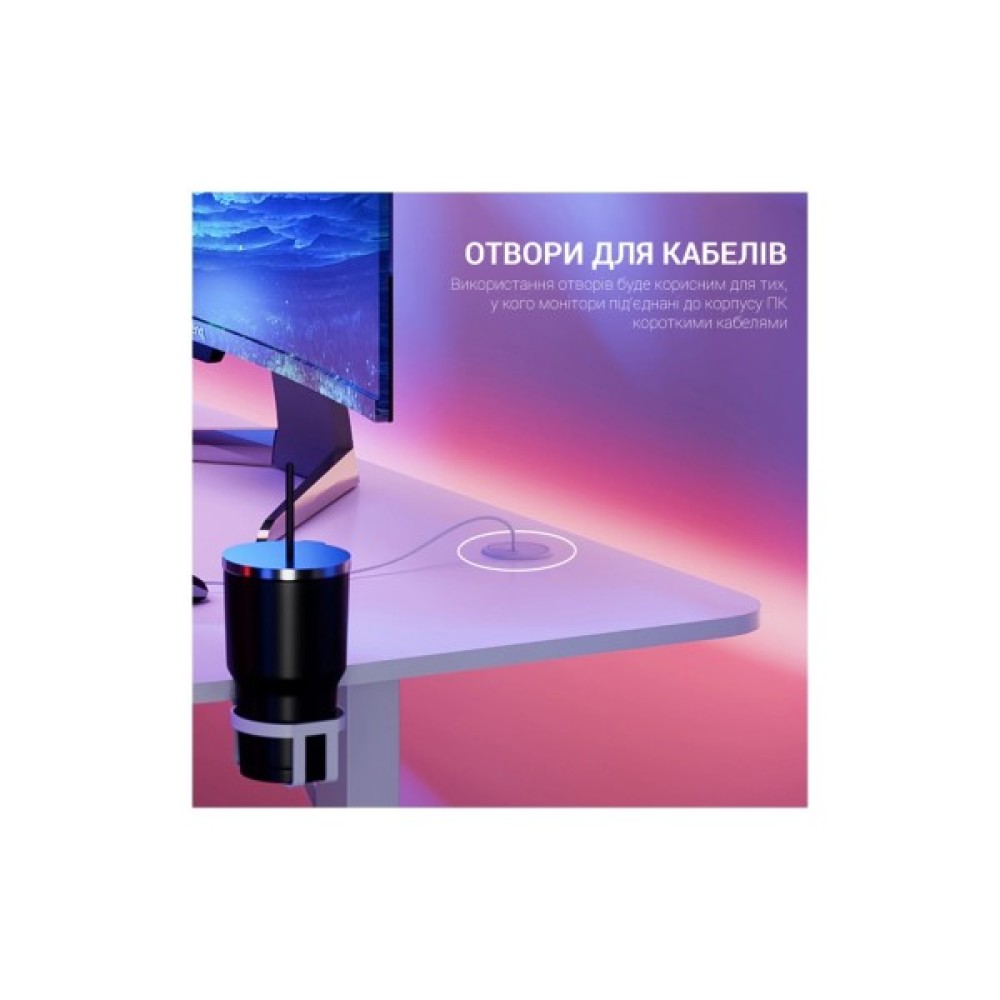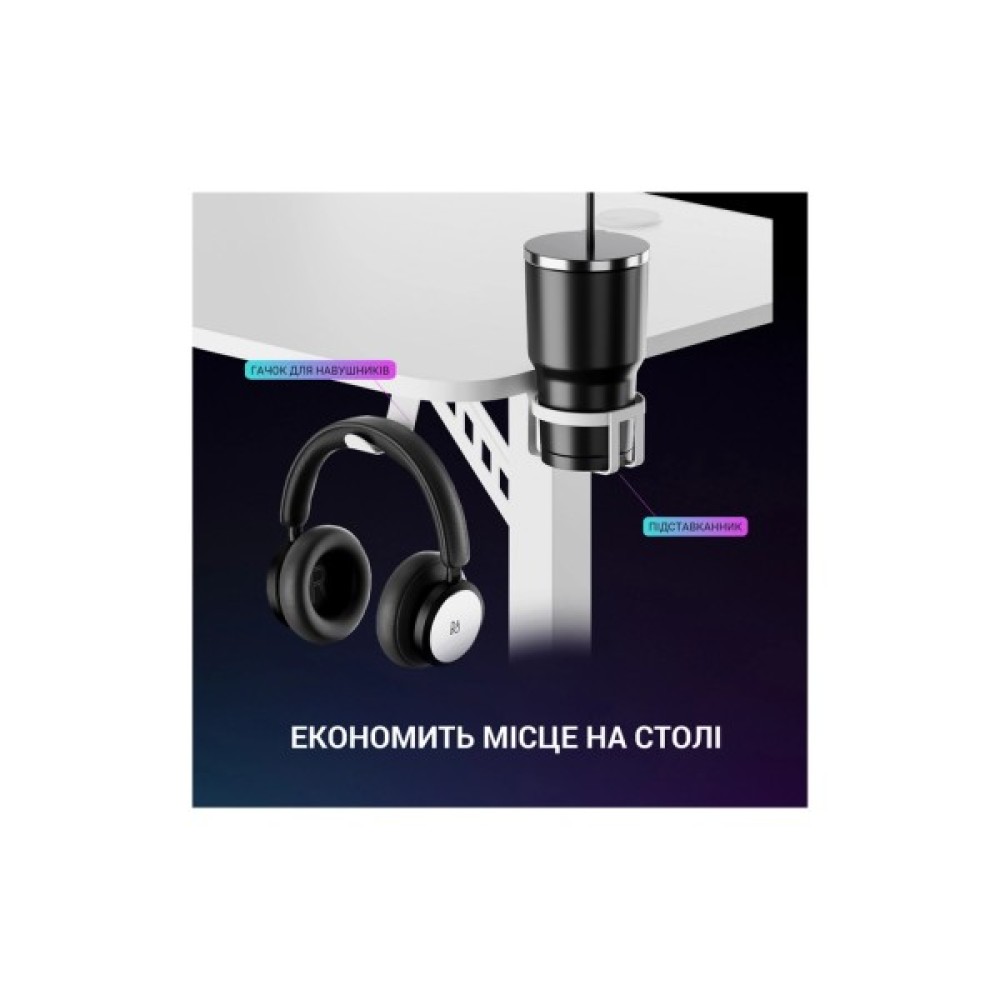 Текстурована поверхня стільниці надає ігровому середовищу відчуття хай-тек. А кріплення для зберігання гарнітури та підсклянник допомагають досягти ще більшого порядку на робочому місці та звільняють додатковий простір.