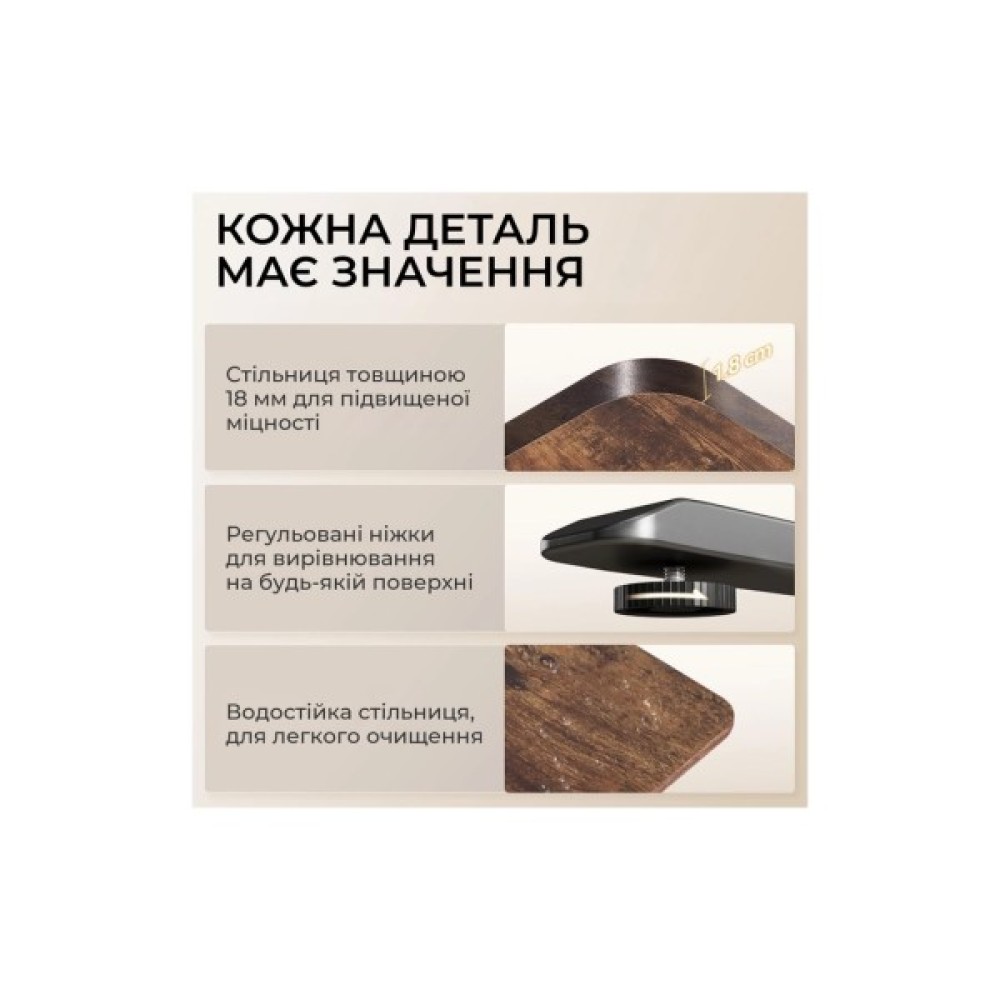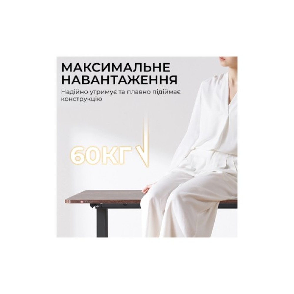 Важливим елементом безпеки є технологія захисту від зіткнень, яка автоматично зупиняє та відводить стіл, якщо виявляє перешкоду на шляху руху. Під час роботи стіл видає менше ніж 50 дБ шуму, що створює спокійне середовище без відволікаючих звуків. Крім того, за допомогою зручної панелі керування ви можете зберегти до чотирьох налаштувань висоти в пам’яті для миттєвого перемикання між улюбленими положеннями однією кнопкою. Збірка столу проста і займає менше 20 хвилин, що дозволяє швидко почати роботу.