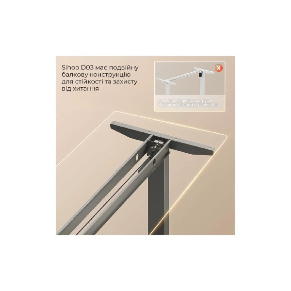 Стіл Sihoo D03 — це сучасний стіл з електрорегулюванням висоти, який дозволяє легко перемикатися між сидінням і стоянням протягом робочого дня. Він плавно регулює висоту від 72 см до 120 см за допомогою тихого безщіткового двигуна, сприяючи кращому самопочуттю та продуктивності. Містка стільниця розміром 140 × 70 см, виготовлена з міцної плити товщиною 18 мм, забезпечує багато місця для моніторів, ноутбука та інших робочих інструментів. Надійна конструкція з подвійною балкою забезпечує виняткову стійкість, витримуючи вагу до 60 кг без хиткості на будь-якій висоті.