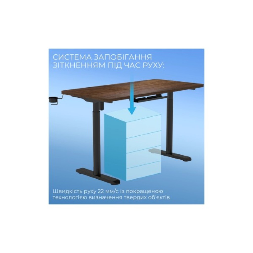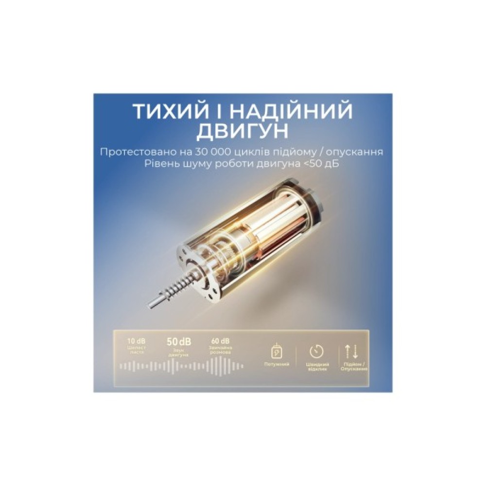 Конструкція відрізняється надійністю: стіл здатний витримати навантаження до 100 кг у статичному положенні та до 70 кг під час руху, забезпечуючи повну безпеку використання. Безщітковий двигун працює дуже тихо, рівень шуму не перевищує 50 дБ. Міцні ніжки діаметром 70 мм гарантують відмінну стійкість та відсутність вібрацій на будь-якій висоті.