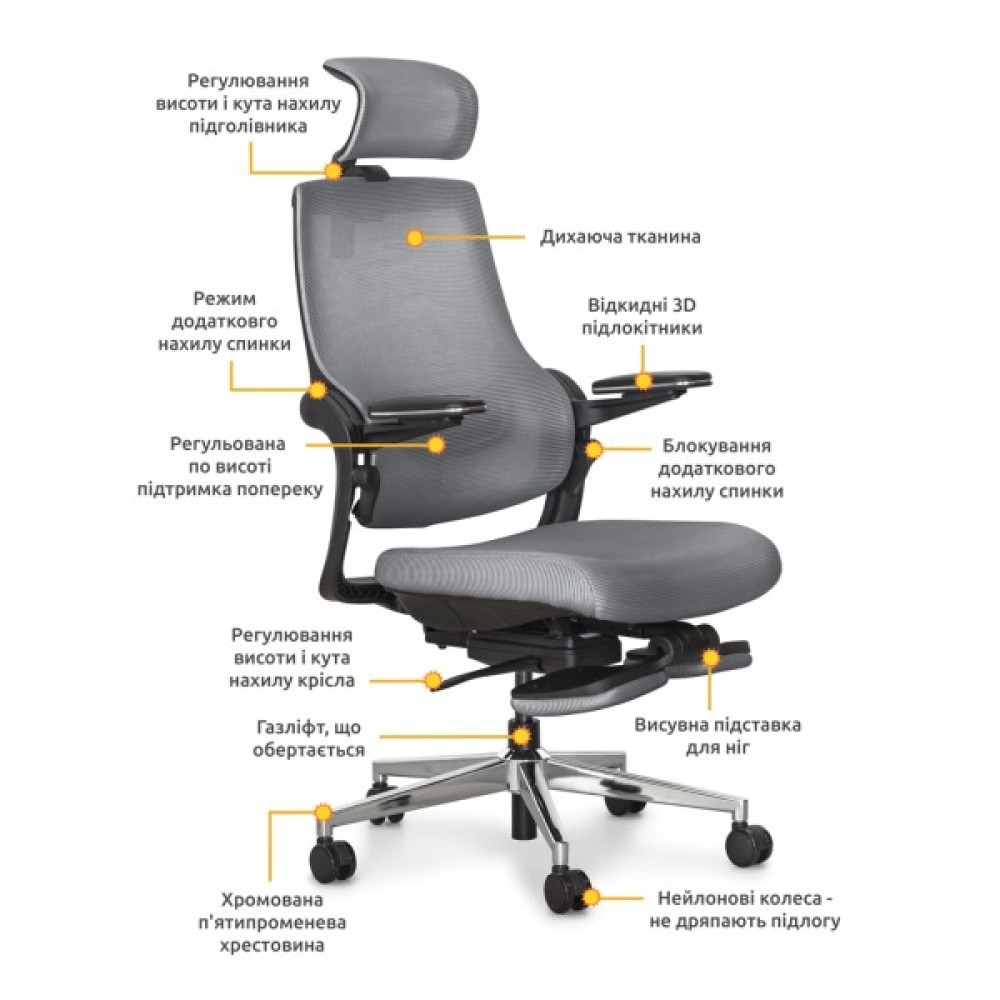 режим гойдання; регулювання жорсткості гойдання; регулювання висоти посадки; наявність підлокітників; регулювання кута нахилу спинки; регулювання підлокітників; наявність підголівника; регульований підголівник; висувна підніжка