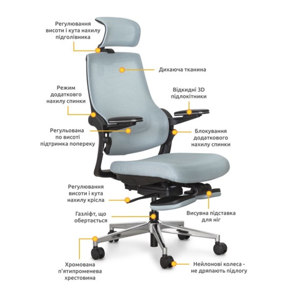 режим гойдання; регулювання жорсткості гойдання; регулювання висоти посадки; наявність підлокітників; регулювання кута нахилу спинки; регулювання підлокітників; наявність підголівника; регульований підголівник; висувна підніжка