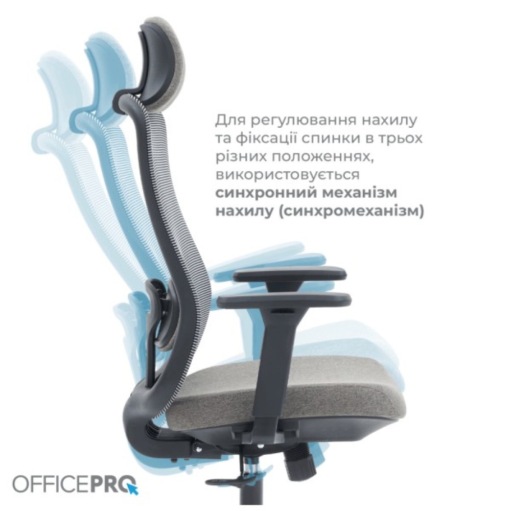 Крісло має нейлонові 3D-підлокітники, оббиті м’яким поліуретаном, які регулюються по висоті, вперед-назад, а також по горизонталі. Синхронний механізм нахилу (синхромеханізм) дозволяє фіксувати спинку в трьох положеннях, а функція регулювання висоти сидіння та гойдання забезпечує додаткові можливості персоналізації під час роботи.