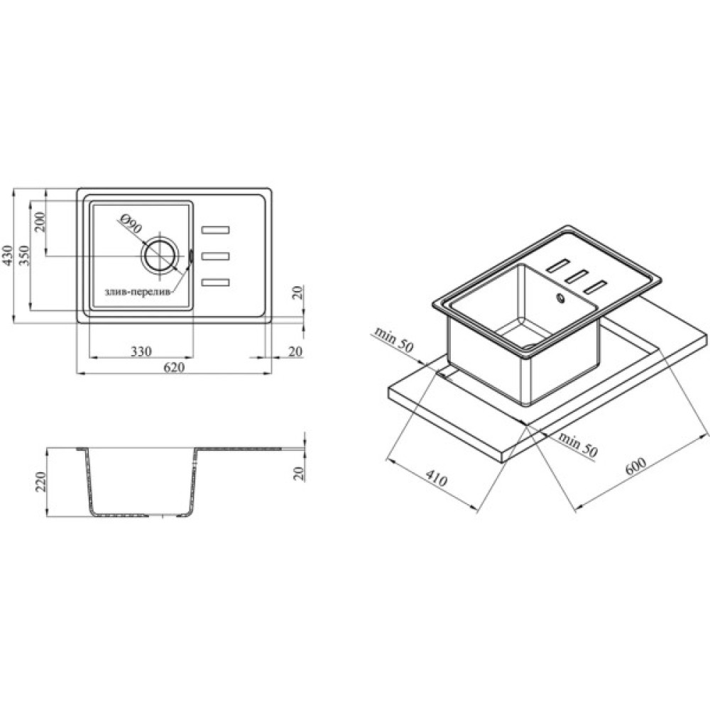 Кількість раковин: 1 основна