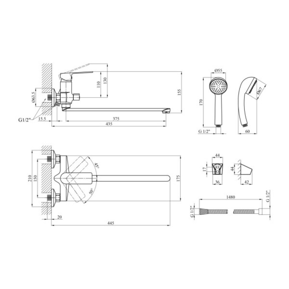 Комплект поставки змішувач; душовий шланг; кріплення; тримач для душу; інструкція; лійка для ручного душу