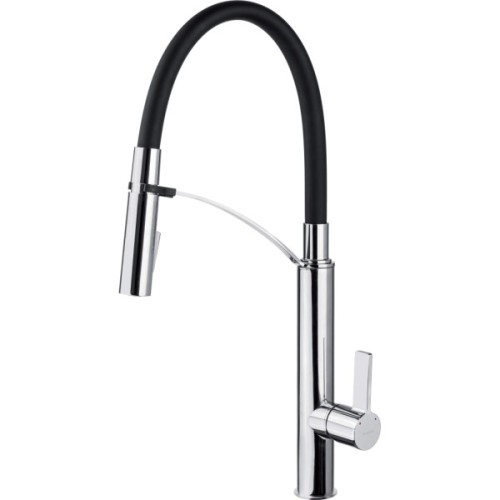 Корпус змішувача виготовлений із латуні найвищої якості. Змішувач обладнаний струменевим аератором. Змішувач із функціональним висувним виливом. 2-х функціональний ручний душ (дощ та струмінь повітря). Монтажна втулка полегшує встановлення змішувача. З'єднувальні шланги завдовжки 45 см у комплекті. Клас витрати Z (4-9 л/хв) дозволяє знизити витрати води.