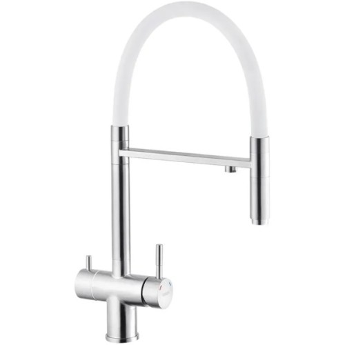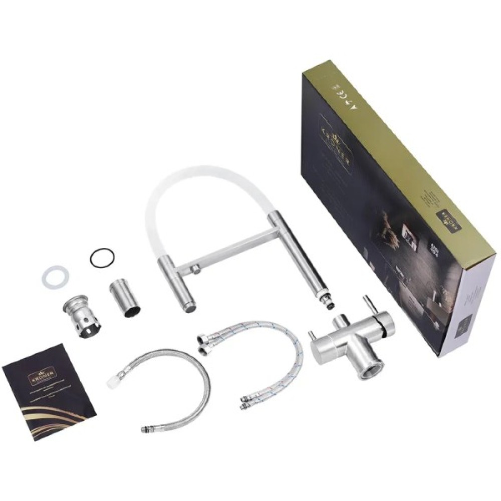 Змішувач для кухні з підключенням до фільтра Kroner (KRP) Edelstahl Klassisch-ESG03815WHI виготовлений з високоякісної нержавіючої сталі, яка не піддається корозії, стійка до ударів та появи тріщин. Змішувач має U-подібну форму з трьома контурами підключення води. За участю першого та другого здійснюється підключення холодної та гарячої води, де змішування відбувається за допомогою картриджа.