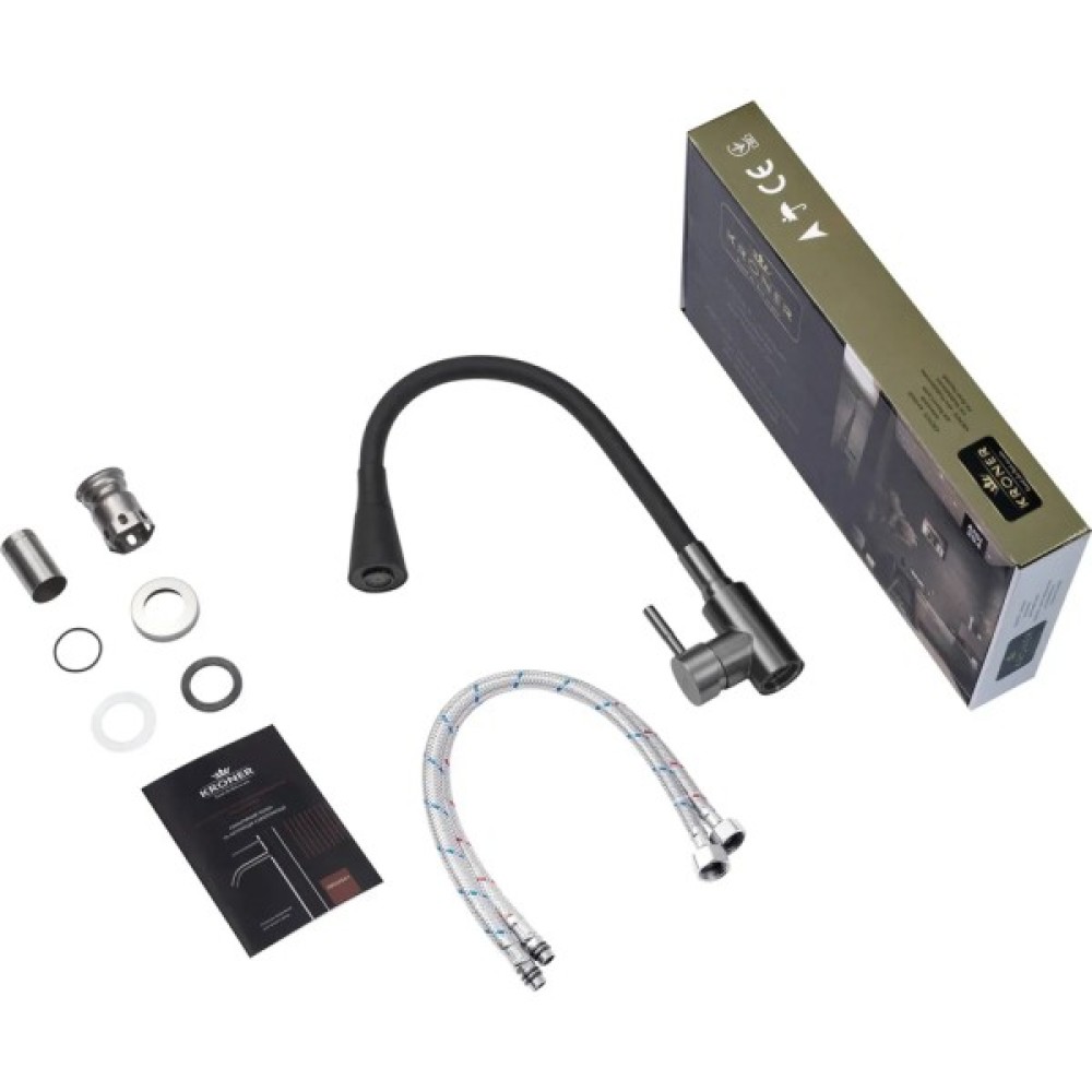 Kroner PVD031BLK - виразний та сучасний змішувач у преміальному виконанні. Його корпус у кольорі графіт із зносостійким PVD-покриттям надає кухні глибокого акценту та підвищеної стійкості до механічних впливів. Чорний гнучкий вилив підкреслює строгий стиль і надає додаткової виразності.