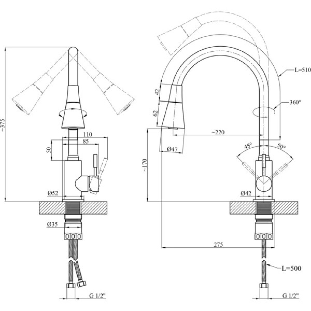• Вилив: гнучкий, поворотний (силікон/пластик)